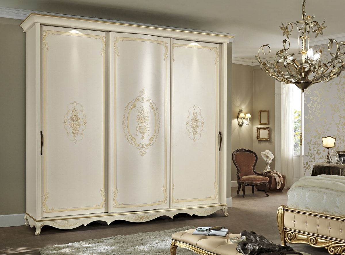 L’armadio Achilea, 3 ante scorrevoli è patinato e decorato. Le ante sono lavorate esclusivamente a mano in ogni loro dettaglio! Possibilità di arricchirlo con specchi.