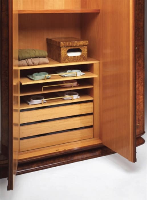 Armadio a 6 ante con cristalli molati e incisi, top e basamento in massello di zebrano, cassettiera interna.