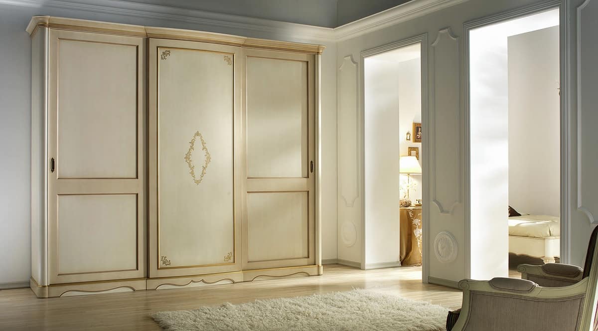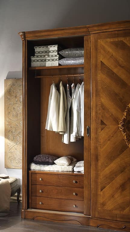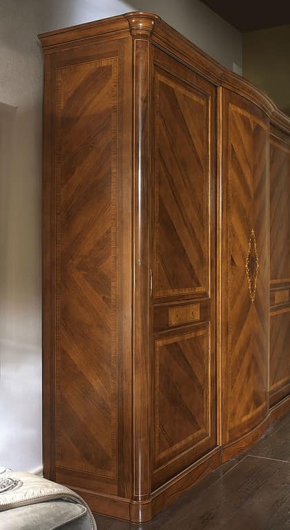 Estetica, stile ed una accurata ricerca di decorazioni intarsiate e impiallacciature di pregio danno vita a questi armadi di Villa Giusti. In essenza di noce, con decori in acero, il tutto esaltato dall’importanza del processo di finitura. La versione laccata è decorata a mano da pittori artigiani.
