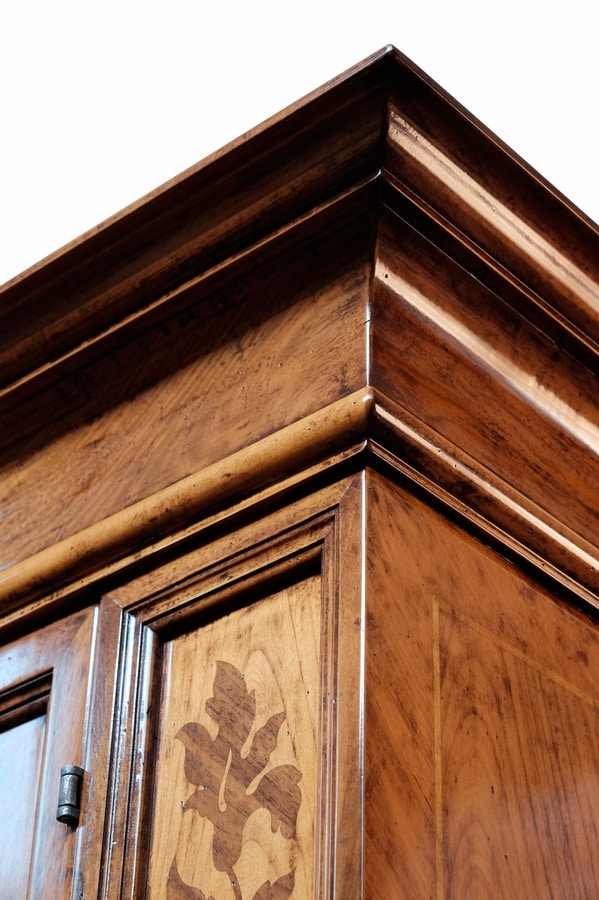 Armadio intarsiato in noce e ciliegio, con 2 porte, 2 cassetti interni e 2 antine, per ambienti in stile classico