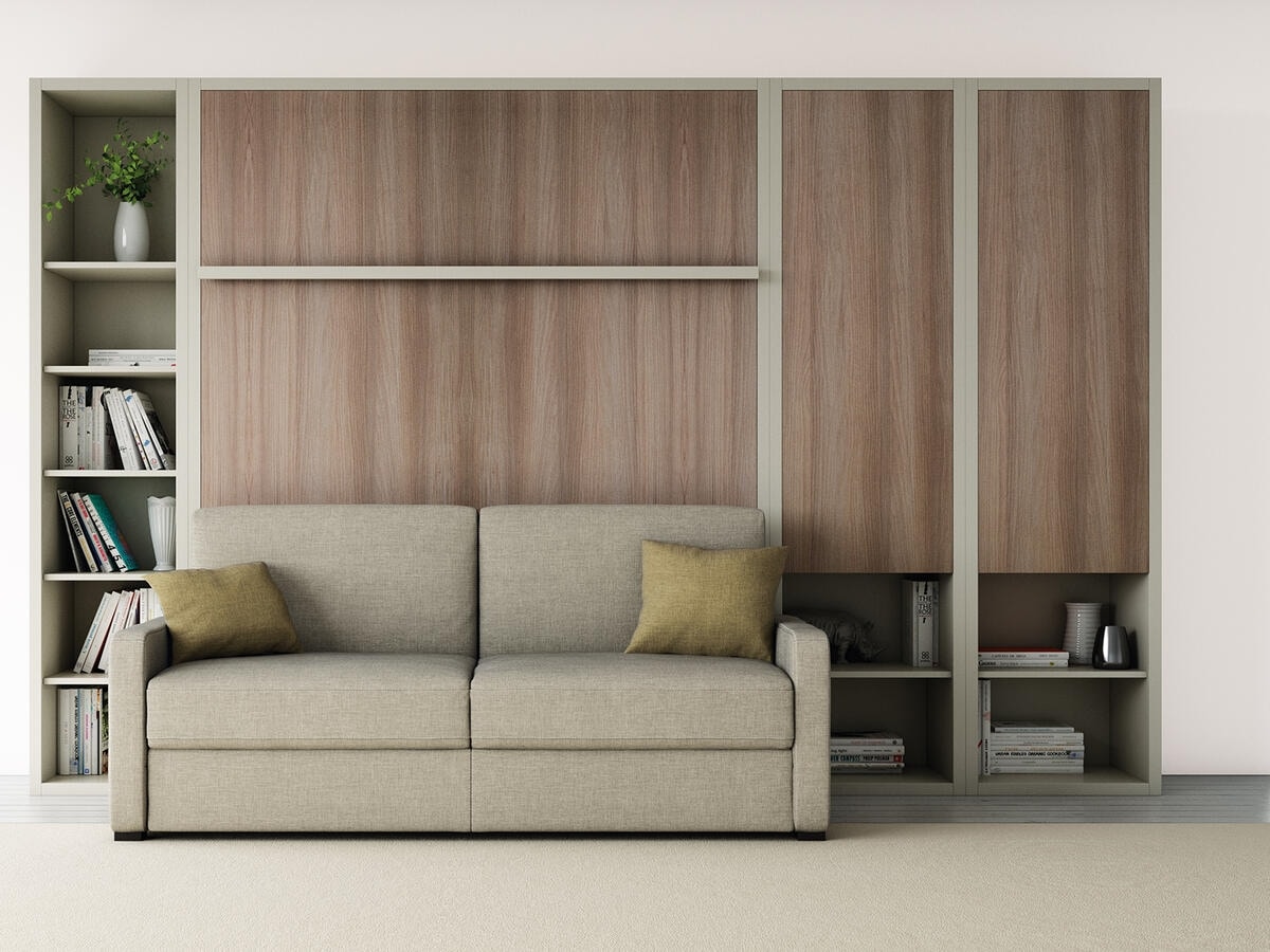 Armadio con letto ribaltabile e con divano integrato. Soluzione salvaspazio personalizzabile nelle finiture.