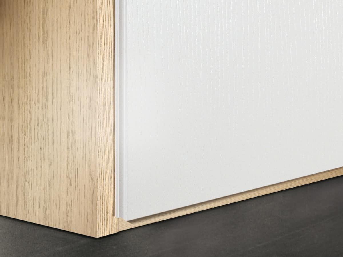 Spiccata la personalità dell’anta Idra dall’estetica lineare e pulita, senza maniglie: gli spazi delle prese d’apertura a gola tra le ante fungono da moderne maniglie a tutt’altezza, praticissime e bellissime … per sempre.