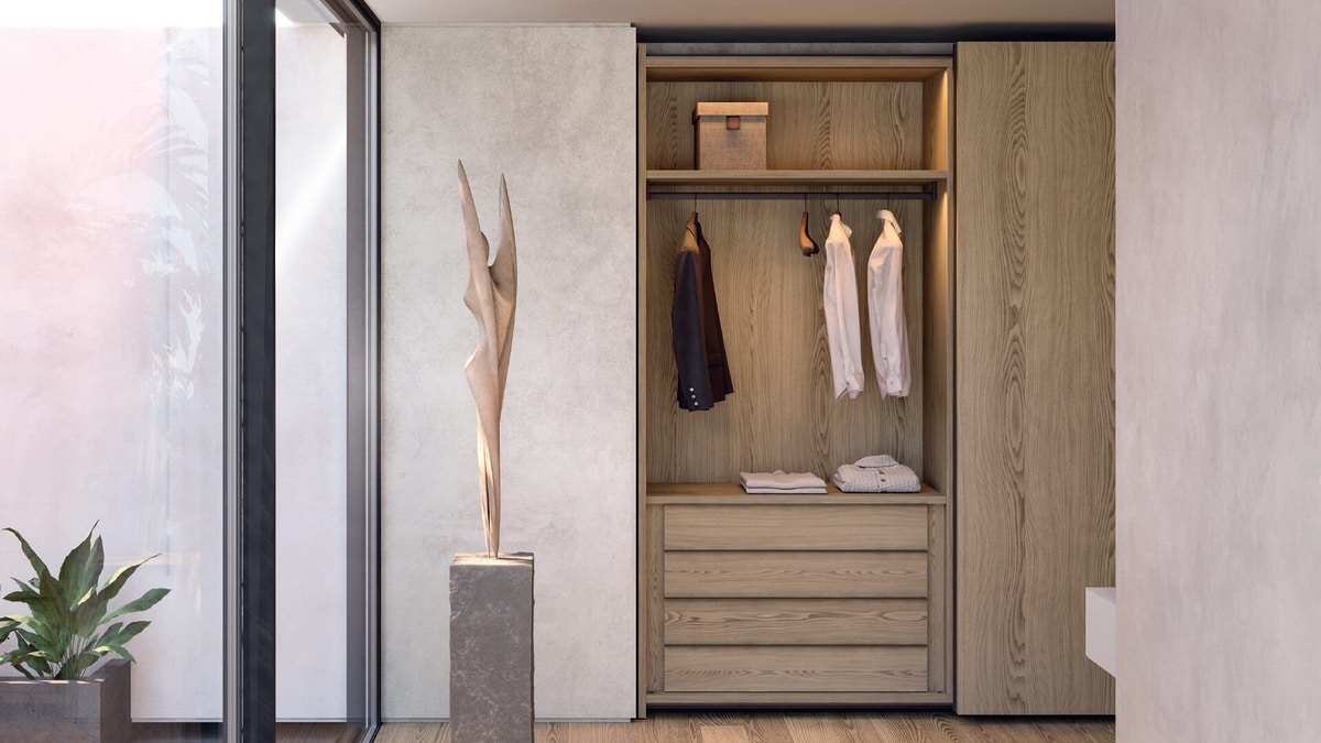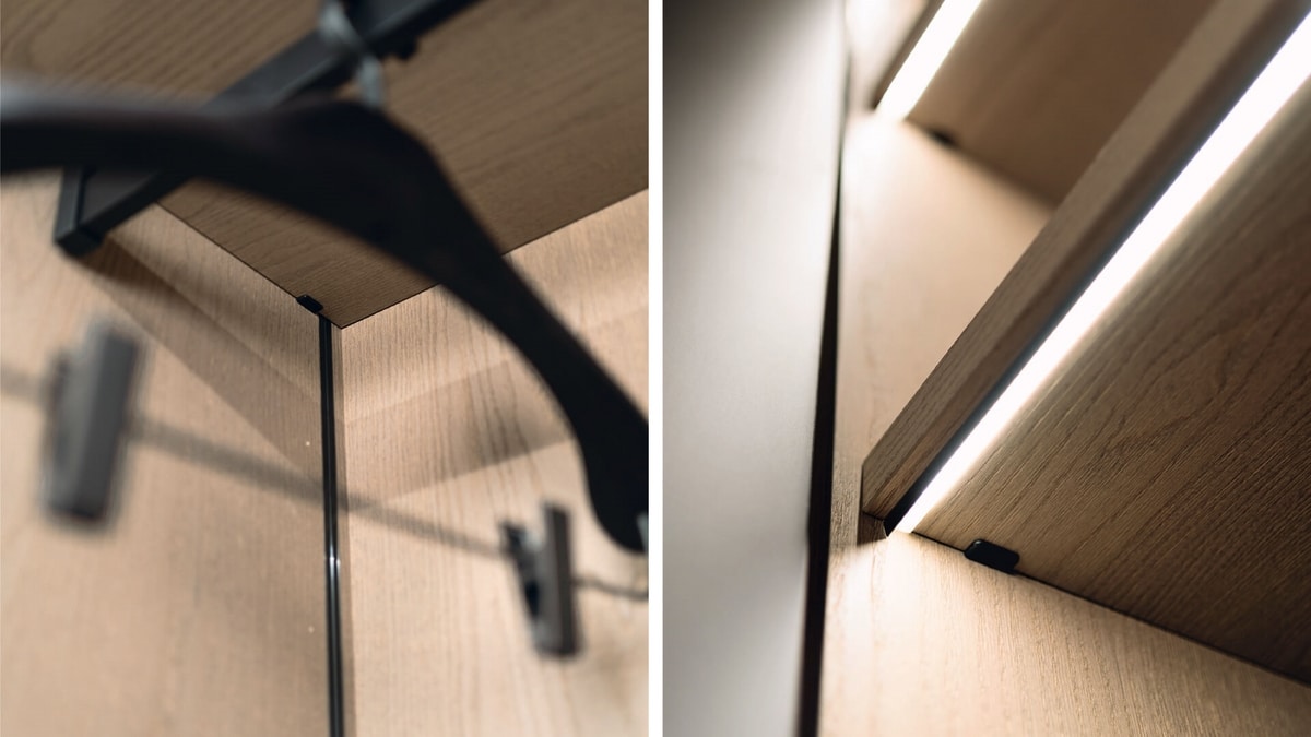 Il sistema armadi Elli si evolve costantemente con nuove soluzioni estetiche e funzionali, offrendo massima flessibilità progettuale. La struttura modulare permette configurazioni su misura, adattandosi a qualsiasi architettura. Fianchi a telaio, anche in vetro, schienali, basamenti e ripiani si combinano con diverse tipologie di ante, battenti o scorrevoli, mentre le finiture spaziano dalle essenze legno ai materici alle superfici più raffinate, come il vetro, che trasforma gli armadi in preziose teche espositive. Cassettiere, attrezzature interne e accessori completano una proposta sofisticata, capace di coniugare funzionalità e design in ogni spazio.