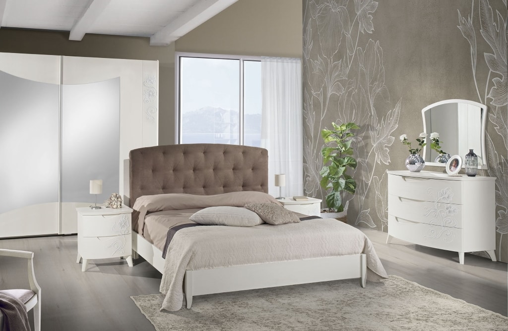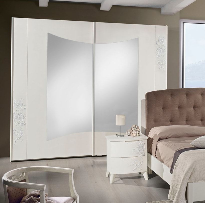 Armadio modello Emily 2 ante scorrevoli, frassino bianco, decorato a mano, con specchi . Chiusura ante ammortizzata.