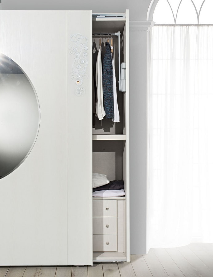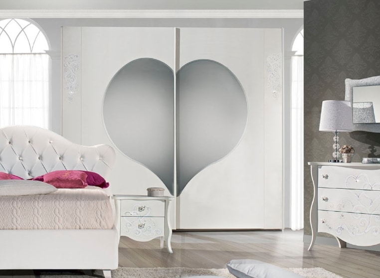 Armadio modello Ilary 2 ante scorrevoli, frassino bianco, decorato a mano, con specchi a cuore. Inserti swarosky sul decoro. Chiusura ante ammortizzata.