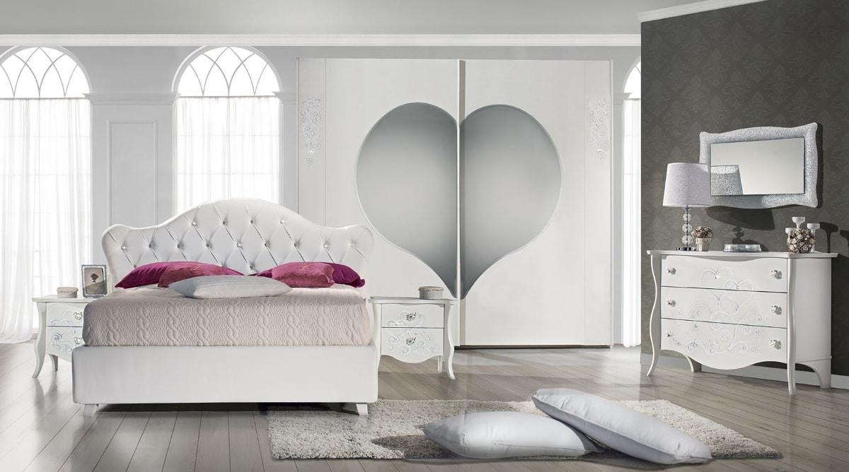 L’Armadio Ilary nasce da un idea romantica di camera da letto, caratterizzato dallo specchio a cuore e dai decori eseguiti a mano a tema.