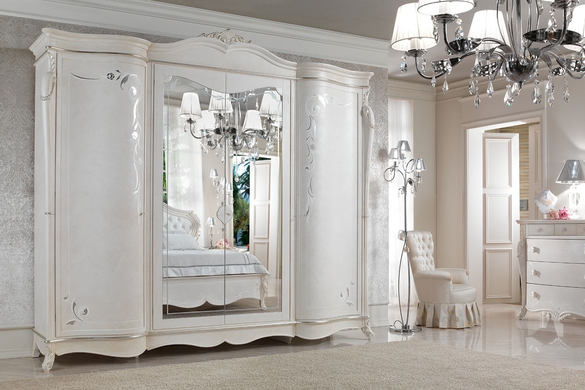 Armadio in stile classico, con struttura in legno laccato con decorazioni realizzate artigianalmente. Dotato di 4 ante a battente, con 2 specchi.