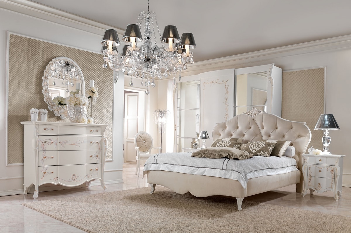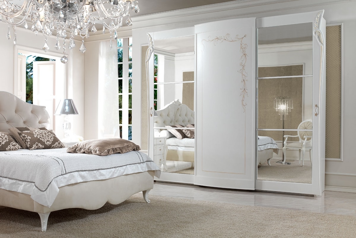 Armadio scorrevole in stile classico, con struttura in legno laccato con decorazioni realizzate artigianalmente. Dotato di 3 ante scorrevoli, con 2 specchi.