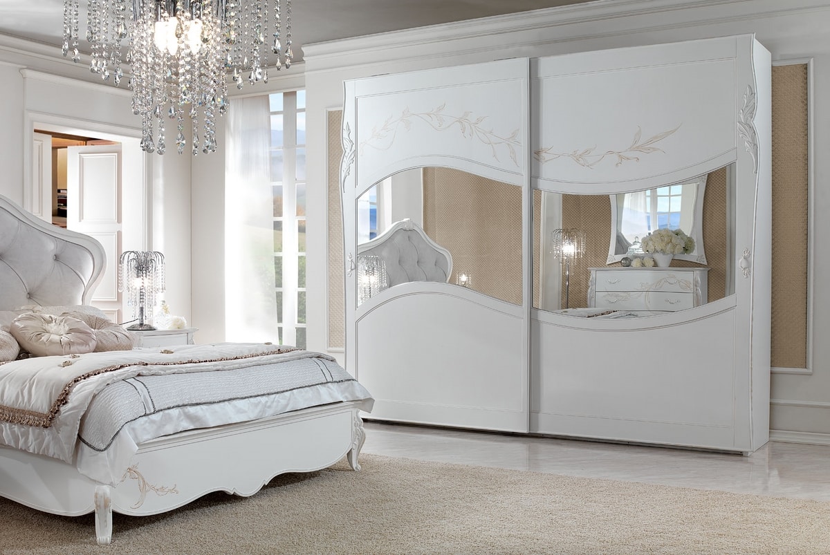 Armadio scorrevole in stile classico, con struttura in legno laccato con decorazioni realizzate artigianalmente. Dotato di 2 ante scorrevoli, con specchi.