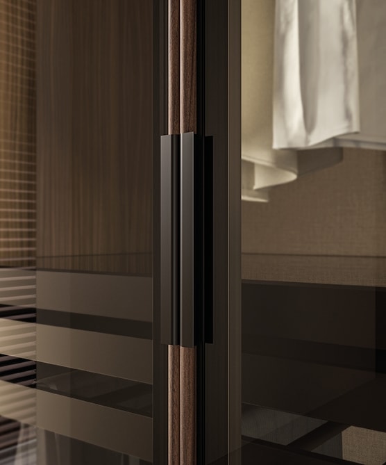 La trasparenza del vetro svela l’anima dell’armadio: l’essenza calda del legno e le maniglie in alluminio si integrano in un equilibrio perfetto. Un incontro di materiali che racconta stile, luce e armonia.