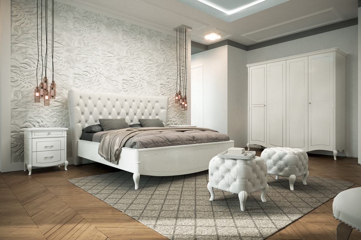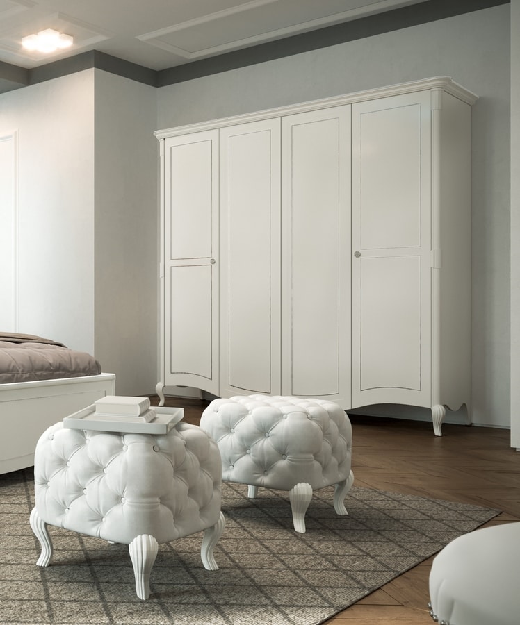 Armadio a 4 ante, in legno laccato bianco con lavorazioni artigianli. Dettagli i foglia Oro o Argento. Include 3 ripiani interni e 3 tubi appendiabiti.