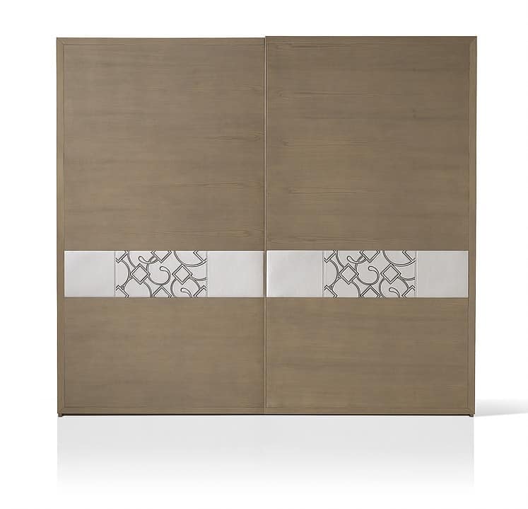 Gli armadi della collezione Street sono realizzati interamente in frassino con decori a rilievo noce Canaletto. Le ante sono scorrevoli e possono avere lo specchio bronzato nella parte superiore oppure legno.
