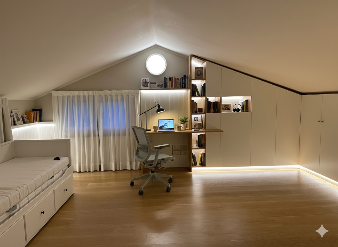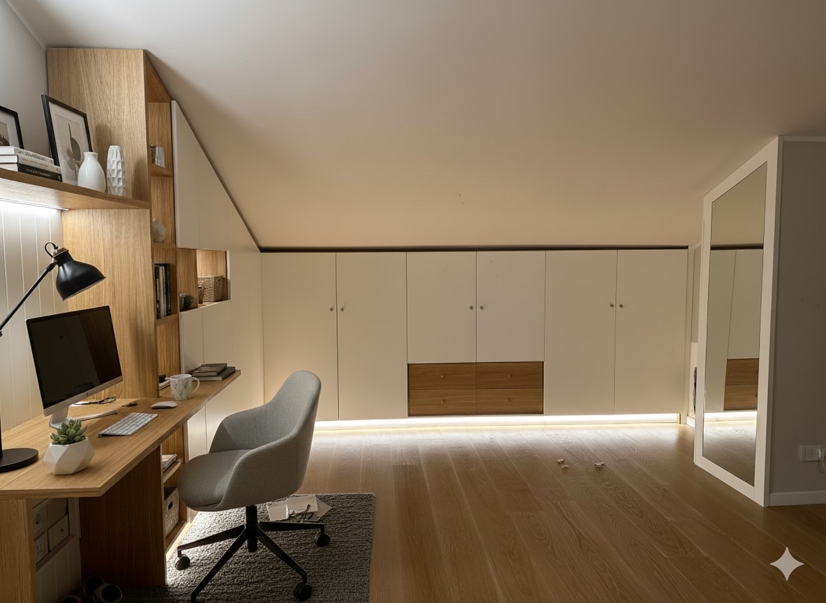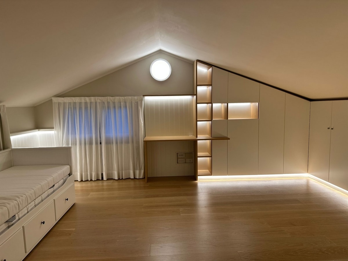 Richiedi prezzi Prodotti similiArmadio su misura per mansarda, dal design moderno. Ante con finitura laccata. Cassetti in essenza legno. Con libreria con illuminazione a LED e scrivania.