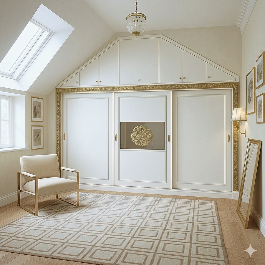 Richiedi prezzi Prodotti similiArmadio su misura ideale per ottimizzare lo spazio in alte mansarde. Finitura laccata, con decorazioni oro. Tre ante scorrevoli nella parte bassa e sette ante a battente nella parte alta.