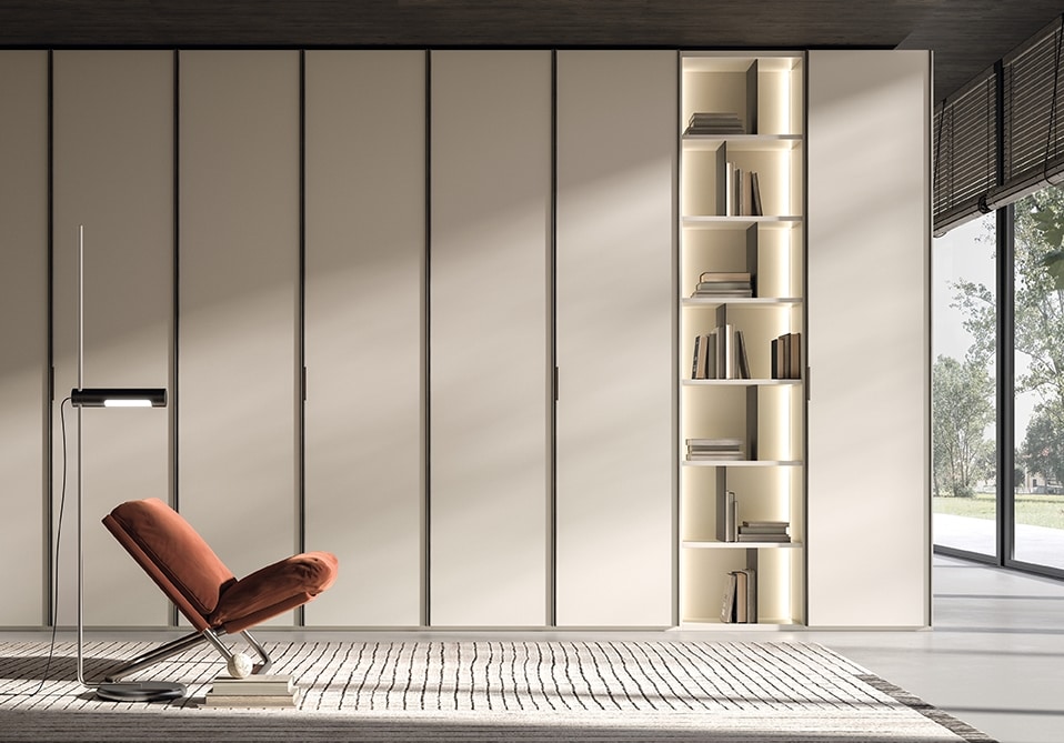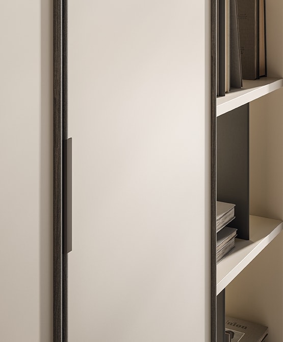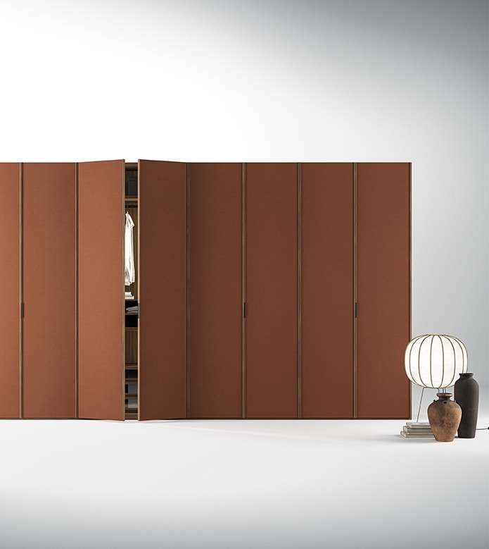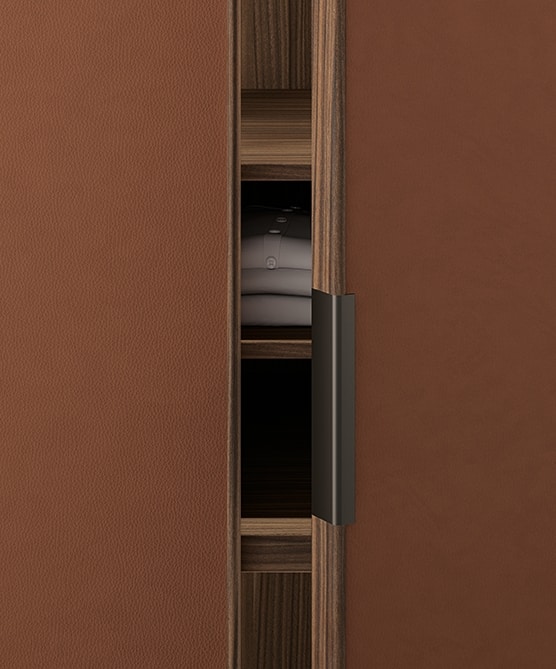 Lineare ed elegante, con profili verticali noce e olmo scuro, l'armadio Kyoto diventa un elemento distintivo dell’ambiente, anche nella versione in Tecnopelle.