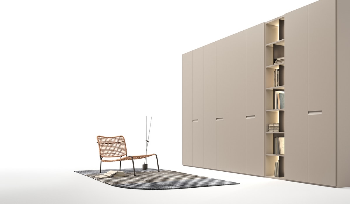 Il dettaglio ricercato nel disegno della maniglia dà vita ad un progetto coerente con uno stile di vita sofisticato senza eccessi, l’armadio Nove con anta in tamburato laccato opaco è un classico contemporaneo da segno distintivo.