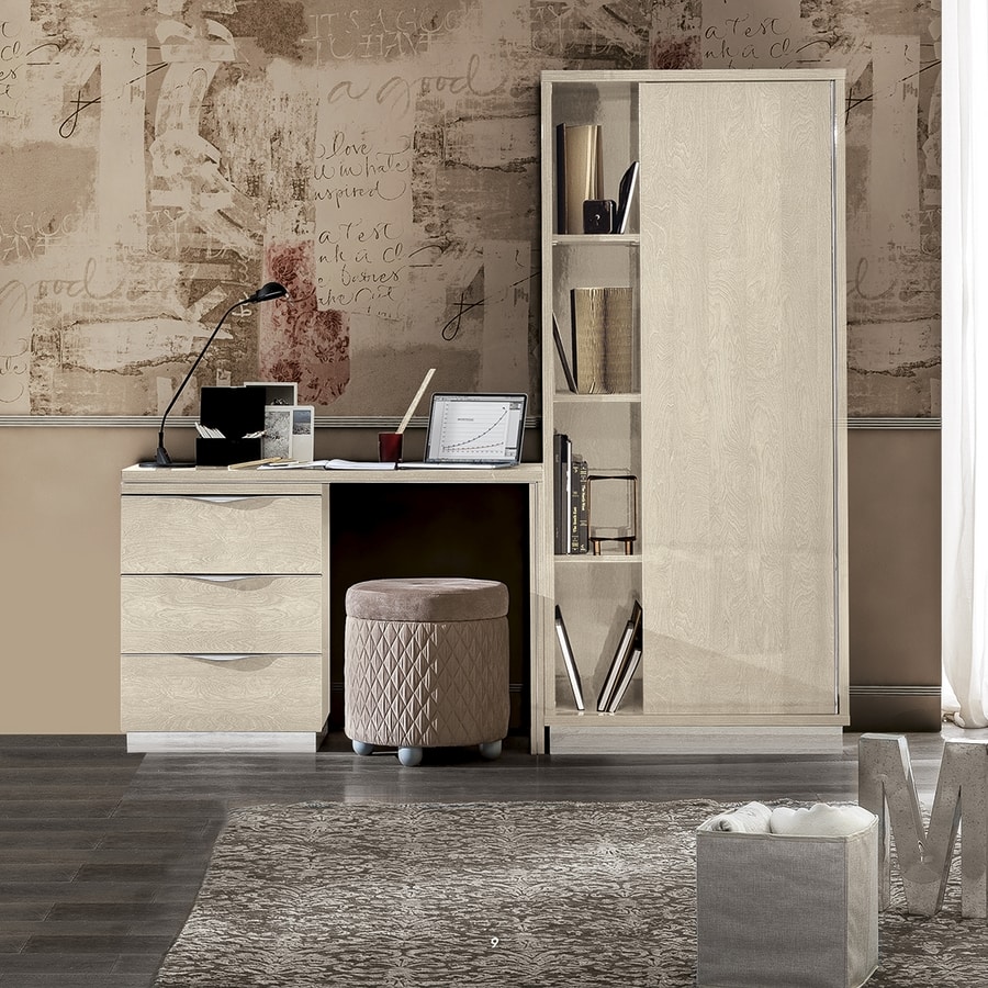 Armadio da camera con scrivania, in legno finitura sabbia o argento/betulla. Il platino è un metallo prezioso per gioielli e anche una gradazione di grigio tipica della lingua inglese. Evoca interni domestici sobri, eleganti.