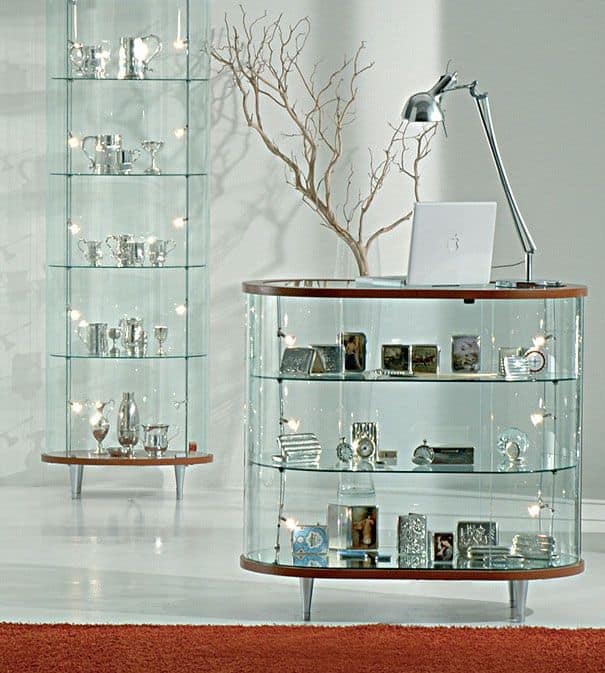 Banco vetrina ovale cristalli temperati – base h cm.3 – luci alogene verticali su due lati – ripiani regolabili in altezza – piedini – base a specchio.