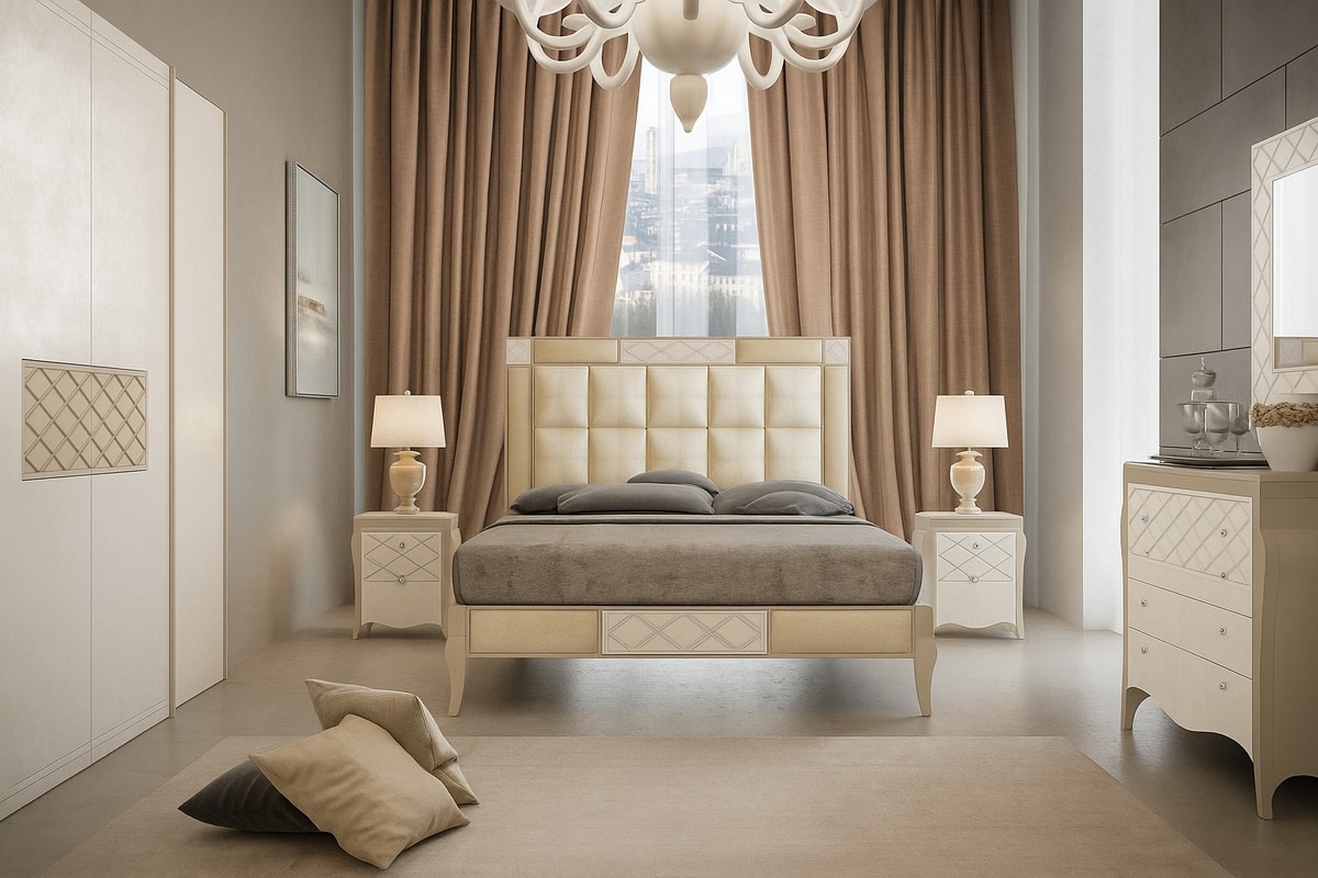 Richiedi prezzi Prodotti similiUna camera completa in stile contemporaneo composta da armadio, letto, comò e comodini, caratterizzata da un design elegante e funzionale. Le superfici sono impreziosite da laccature e finiture ad acqua, mentre i particolari di design includono specchi fumé e raffinate incisioni a rilievo geometriche, disponibili in più varianti per adattarsi a diversi contesti abitativi. L’armadio è dotato di sistemi di scorrimento e guide soft-close rallentate, che uniscono comfort e durabilità, mentre i comò e i comodini offrono ampio spazio contenitivo con un tocco di stile. Il letto si distingue per linee essenziali e la possibilità di personalizzare testiere e rivestimenti in diversi tessuti e finiture. Grazie all’ampia personalizzazione di colori, materiali e decori, questa camera rappresenta la soluzione ideale per chi cerca un ambiente moderno, sofisticato e unico.