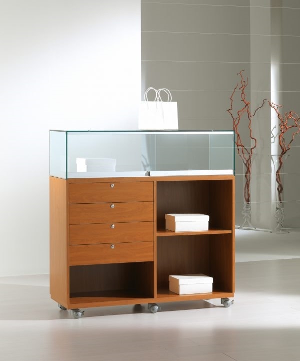 Banco legno con n. 4 cassetti e vani a giorno su ruote – bacheca h 30 cm. in cristallo temperato incollata a raggi UV con n. 2 scorrevoli.