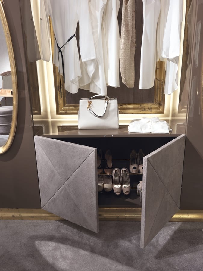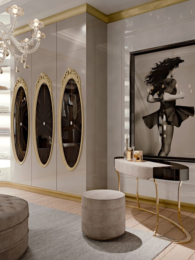 Richiedi prezzi Prodotti similiIl sistema cabina armadio Hotel De Ville è proposto nella versione laccata lucida grigia con ante che supportano specchiere in legno dorato e intagliato. Ad impreziosire il tutto, un inserto in madreperla su campiture in ebano. Anche per la cabina armadio la pelle e il legno scaldano e contrastano l’elegante colore di fondo nel tono caldo del grigio. Ogni vano o contenitore è dotato di illuminazione interna a led, con accensione automatica. Inoltre sono a disposizione una serie di accessori e automatismi da inserire nel progetto su misura. Qui si ambienta perfettamente la consolle trucco, anch'essa in linea con tutto l'arredamento della camera da letto. Bellotti Ezio realizza cabine armadio su misura e in diversi stili, ha a disposizione un team di architetti che sono a disposizione del cliente per studiare le soluzioni in base alle Sue esigenze e i Suoi gusti.