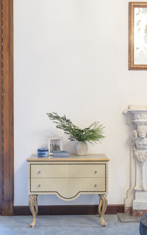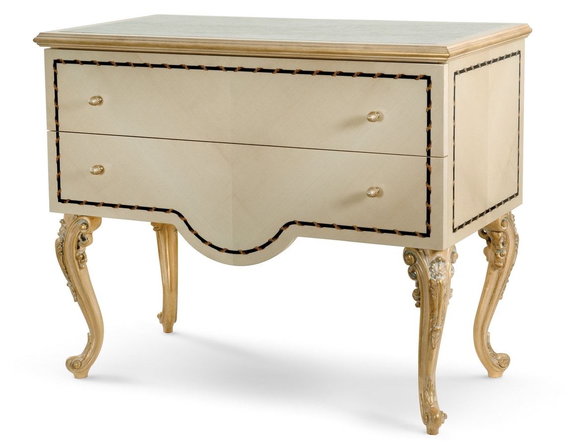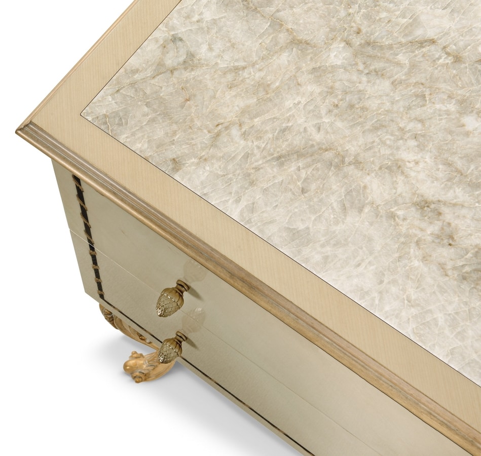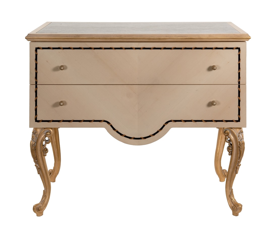 Comò con struttura in acero arricchita da intarsi in pino Carolina e pero sfumato, che disegnano motivi raffinati sulla superficie. Le gambe, finemente intagliate, conferiscono leggerezza alla composizione, completata dalla finitura OCH: oro foglia patinato bianco meringa. Il piano, incassato a filo, è in marmo Taj Mahal, scelto per le sue venature delicate e la luminosità naturale.