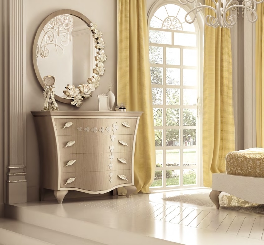 Comò in stile classico in legno, finitura perlato naturale. Dotato di 4 cassetti.