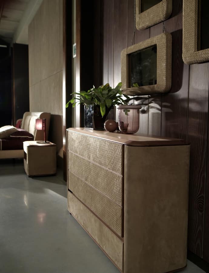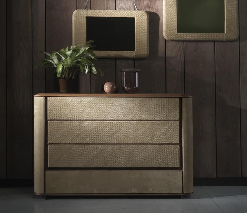 Comò con struttura in legno di noce oppure ebano rivestita in pelle. I frontali dei cassetti sono disponibili rivestiti in intreccio di pelle, disponibile esclusivamente in pelle categoria TOP.