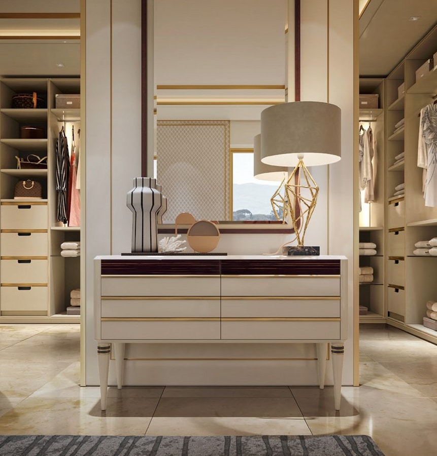 L’unione dei toni chiari di tutti gli elementi d’arredo con gli inserti e i profili dorati, conferisce alla notte della collezione Roma un’immagine sofisticata e singolare, vagamente imperiale. L'intimità si sposa con la finezza, senza rinunciare ad una aristocratica funzionalità.
