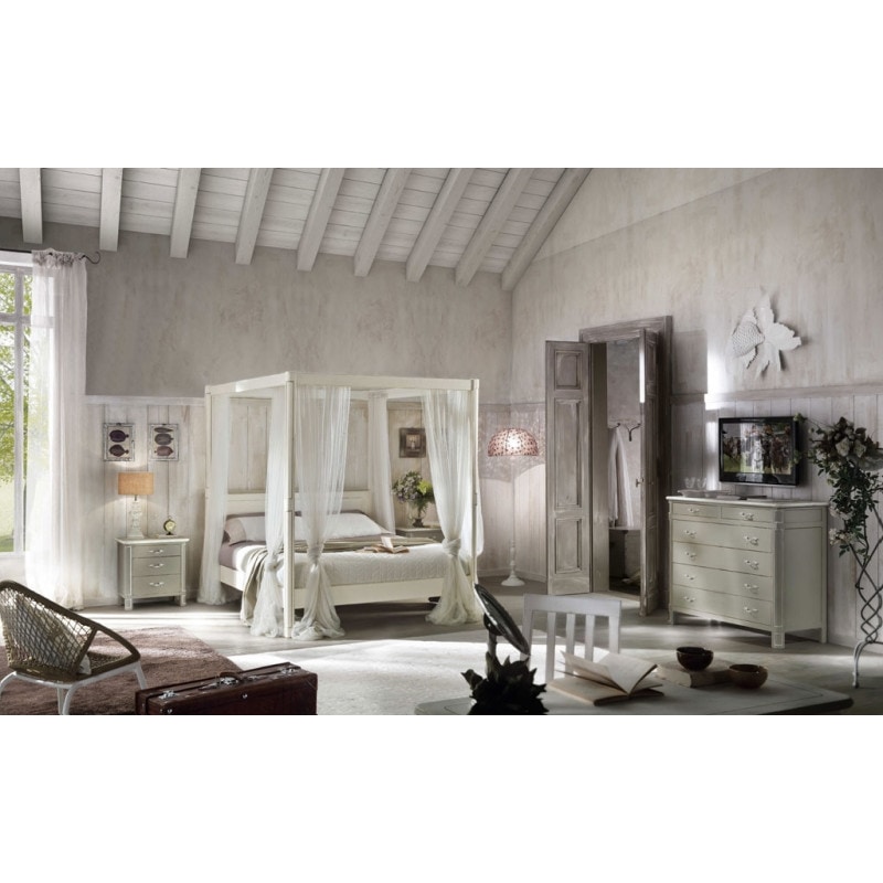 Comò classico con quattro cassetti grandi e due piccoli. Mobile di ispirazione provenzale con fianchi riquadrati, spalle arrotondate ed incise. portabito.