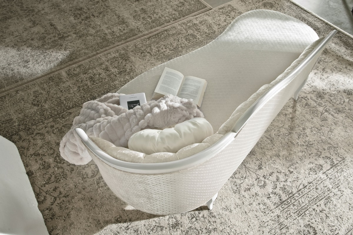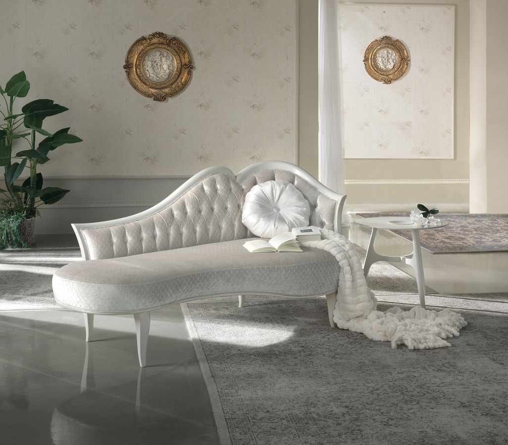 Dormeuse con struttura in legno laccato bianco. Schienale con imbottitura capitonné.
