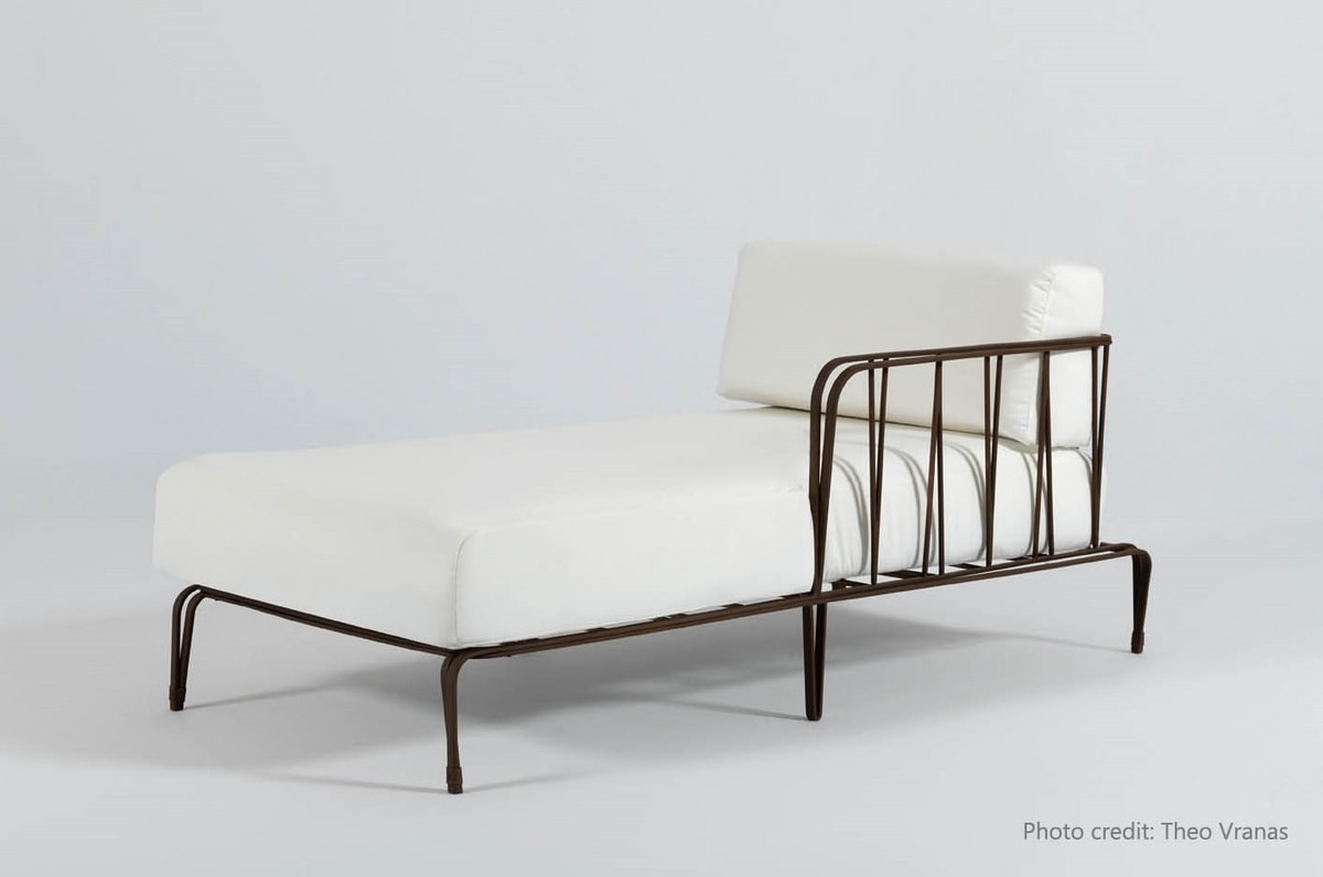 Chaise longue in acciaio inox AISI 304 dalle linee semplici e senza tempo adatta ad arredare diversi tipi di spazi, disponibile anche con finiture da interno, nella versione da esterno zincato e verniciato a polvere, cuscinerie in tessuto Sunbrella incluse.