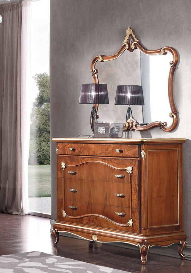 Comò Art Deco in legno, con 4 cassetti . Decori intagliati in finitura foglia oro.