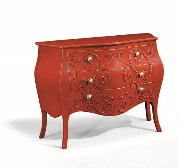Comò dalle linee curve dotato di 3 cassetti, con applicazioni floreali in legno sul fronte.