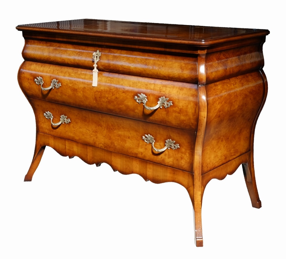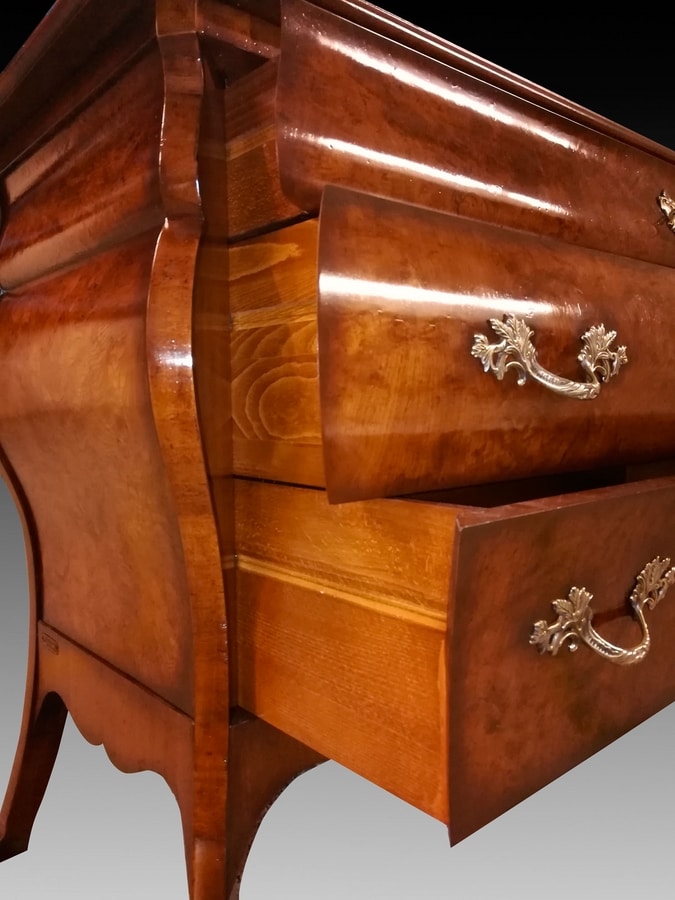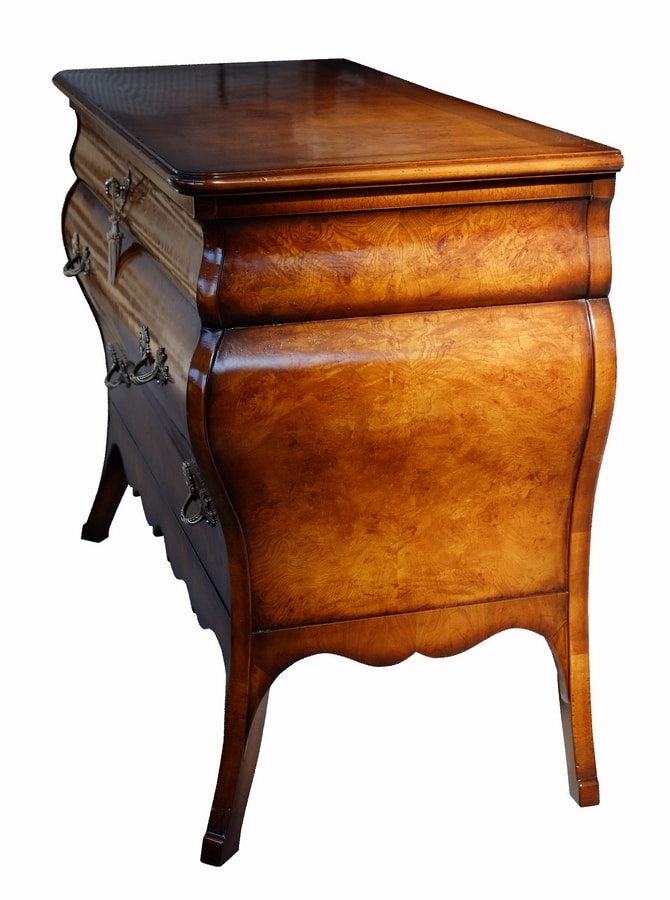 Comò sagomato in radica di frassino olivato, ispirato al 1700 lombardo e fedele riproduzione dell'originale. Suddiviso in tre cassetti con fianchi e frontale sagomati a doppia curva. Gambe sporgenti raccordate da grembiale mistilineo e lastronato in noce nazionale.