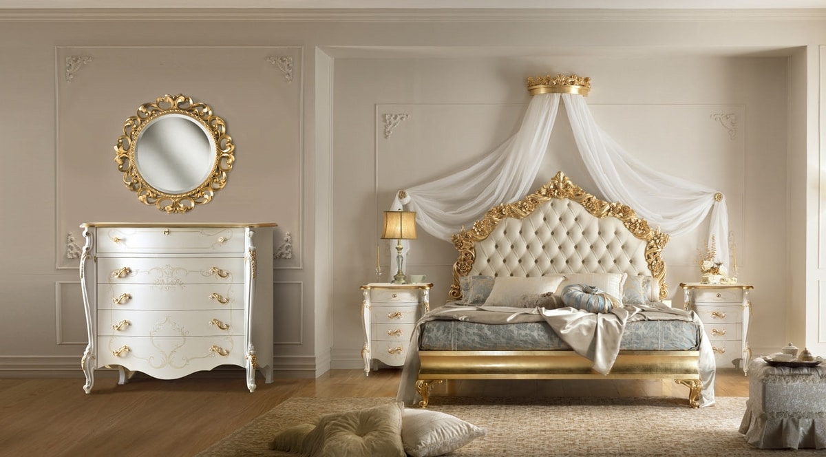 Comò in stile classico, in legno laccato, con dettagli foglia oro. Dotato di 4 cassetti ed anta a ribalta che nasconde ulteriori cassetti.