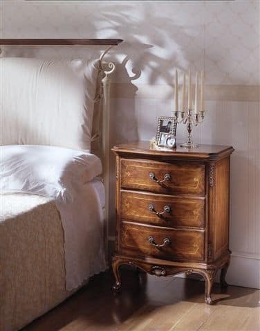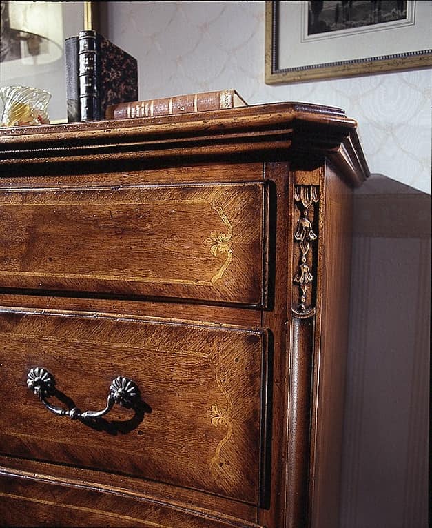 I comò e comodini della collezione Maser sono arricchiti da intagli e intarsi.