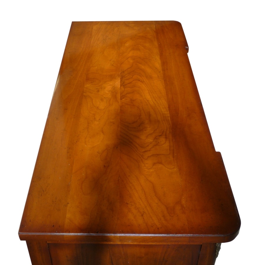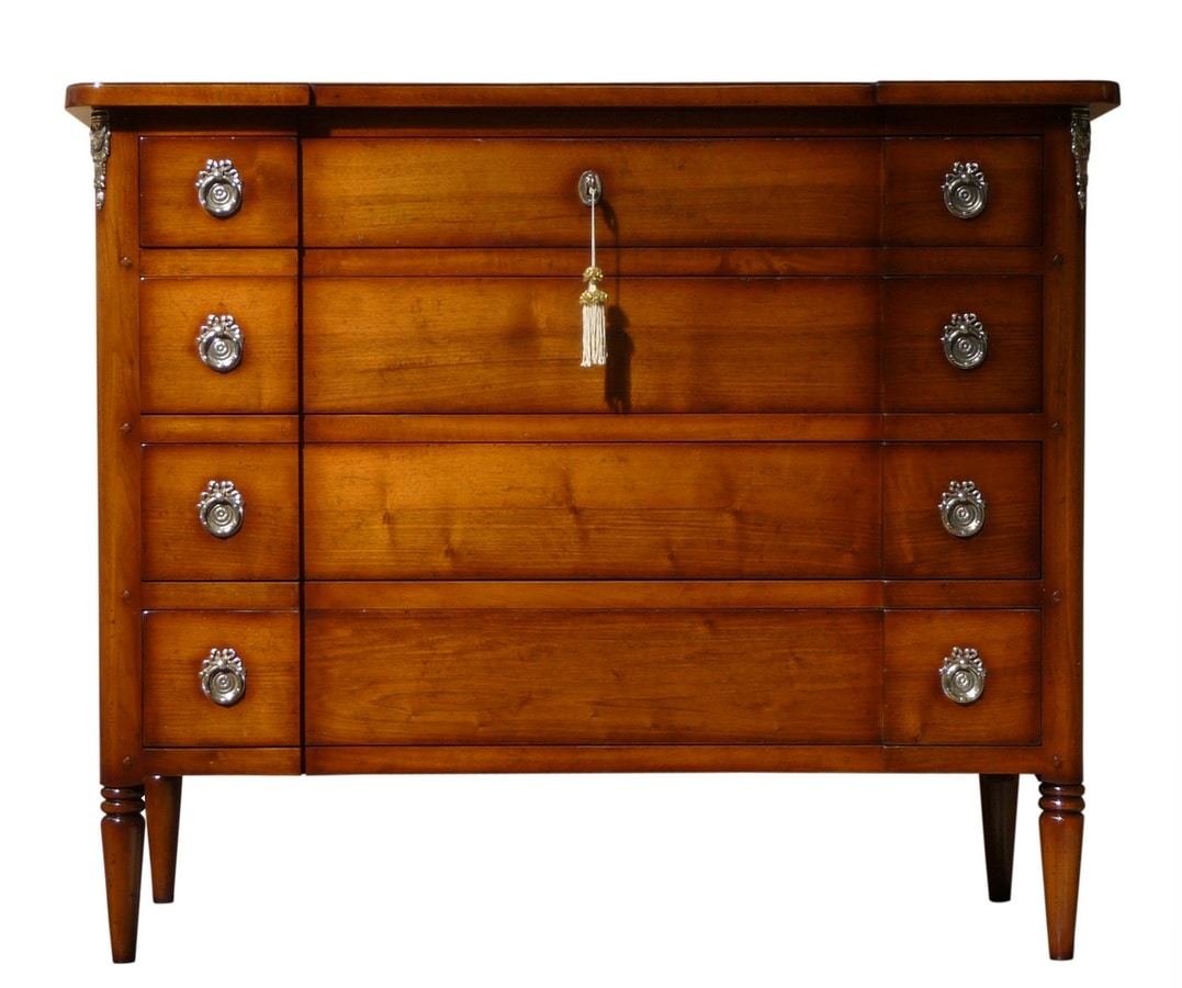 Comò in noce, ispirato allo stile Direttorio del tardo '700 ed inizi '800. Frontale mosso a quattro cassetti ed arricchito da applicazioni ornamentali in ottone fuso, lesene arrotondate che terminano con piedi torniti a spillo con modanatura ad anello.