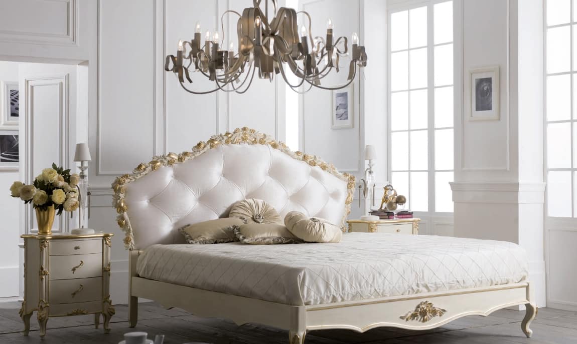 Comodino in stile classico, con tre cassetti. Decorato con intagli artigianali. Dettagli in finitura oro.