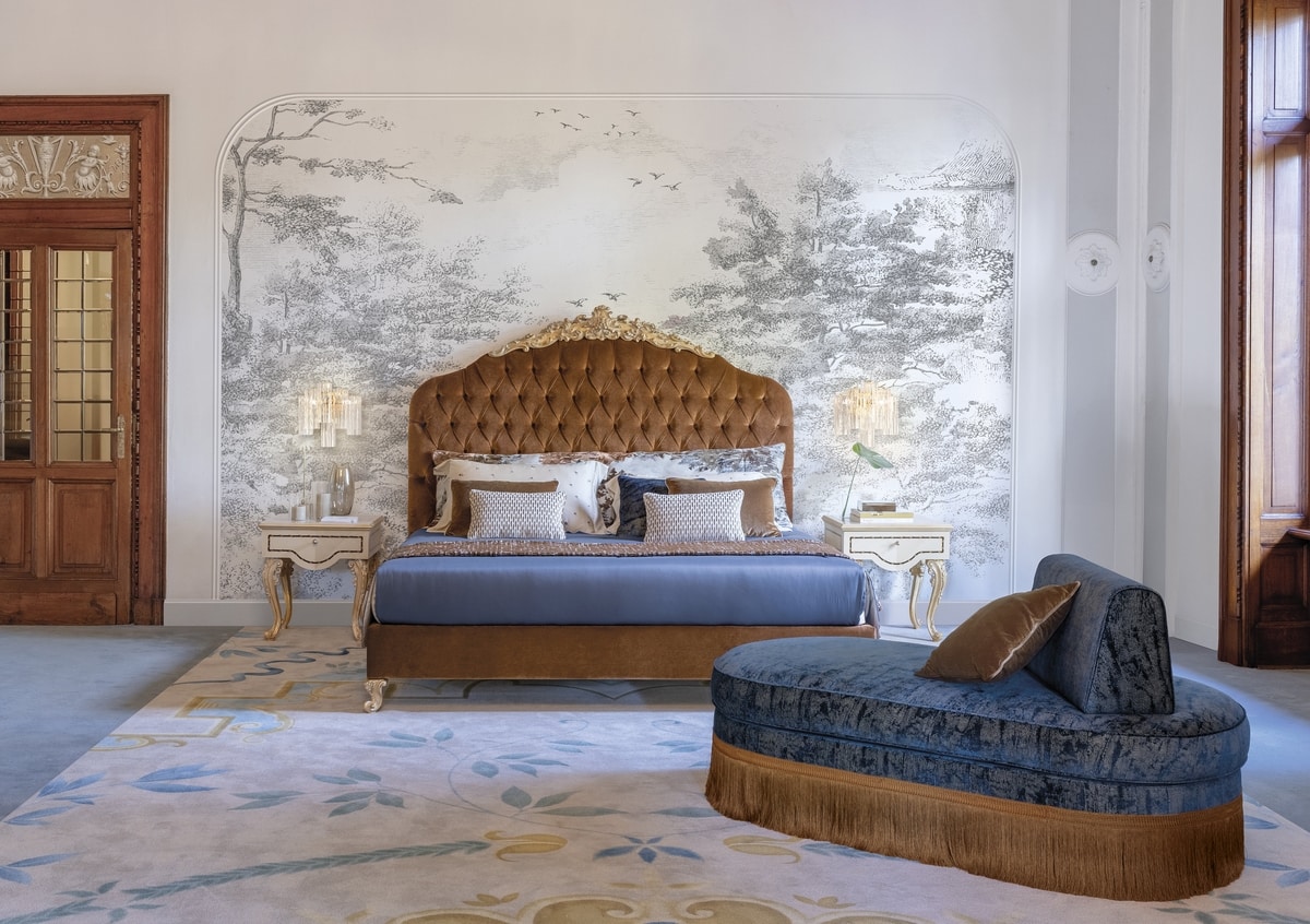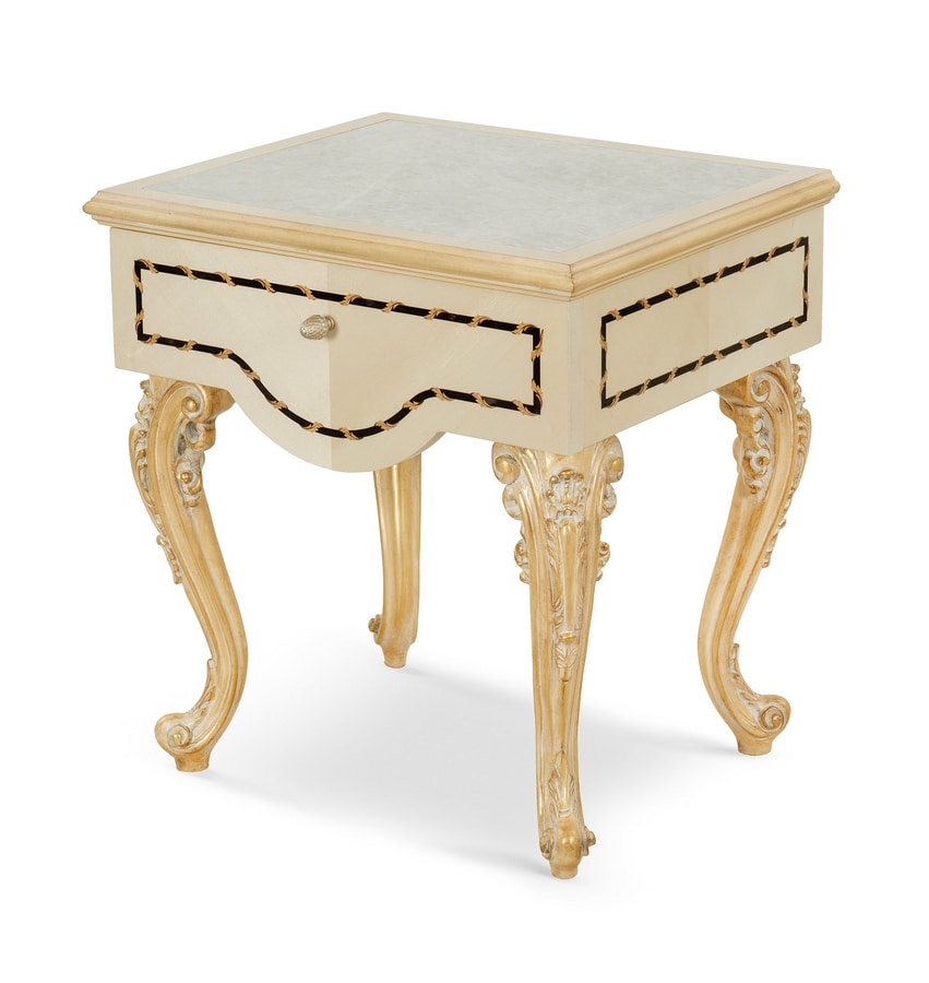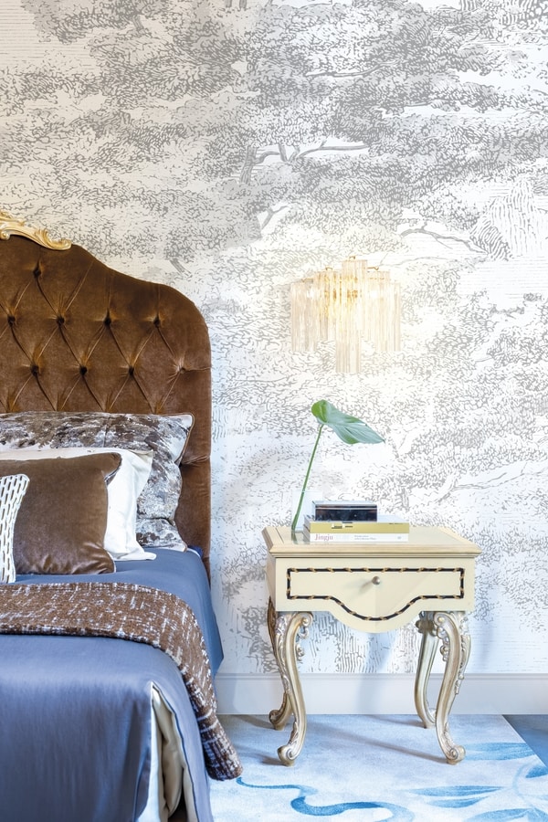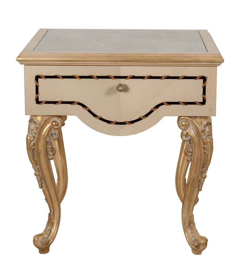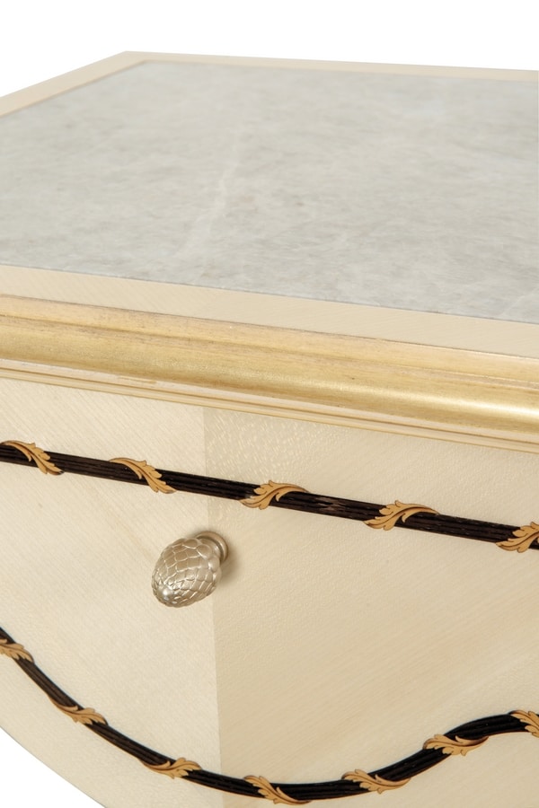 Comodino di pregio con struttura in acero, impreziosita da raffinati intarsi in pino Carolina e pero sfumato. Le gambe, finemente scolpite, dialogano con la ricercata finitura OCH -oro foglia patinato bianco meringa- che avvolge l’intero elemento con delicatezza. Il piano, incassato a filo, è in marmo Taj Mahal, apprezzato per la sua naturale luminosità e le sfumature cromatiche sofisticate.