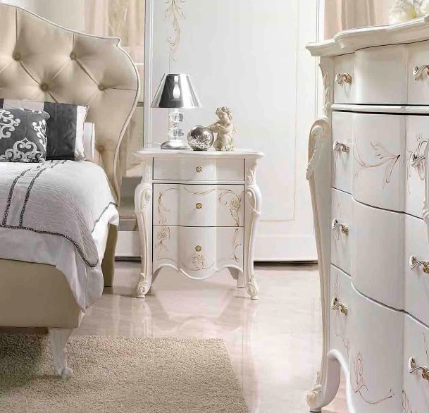 Comodino in stile classico, in legno laccato, con decorazioni realizzate artigianalmente. Dotato di 3 cassetti.