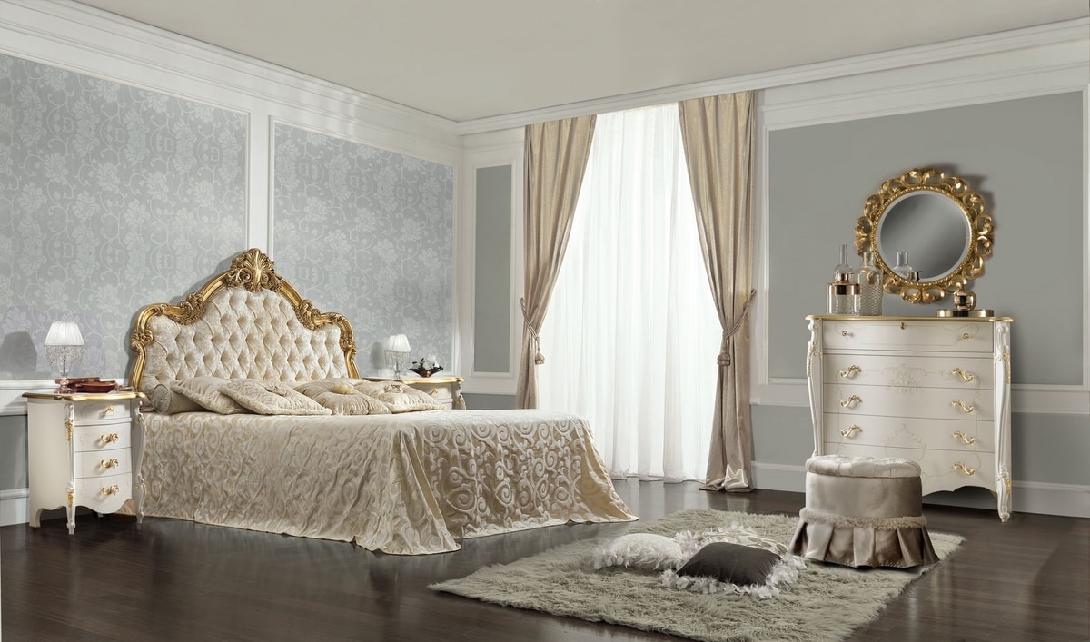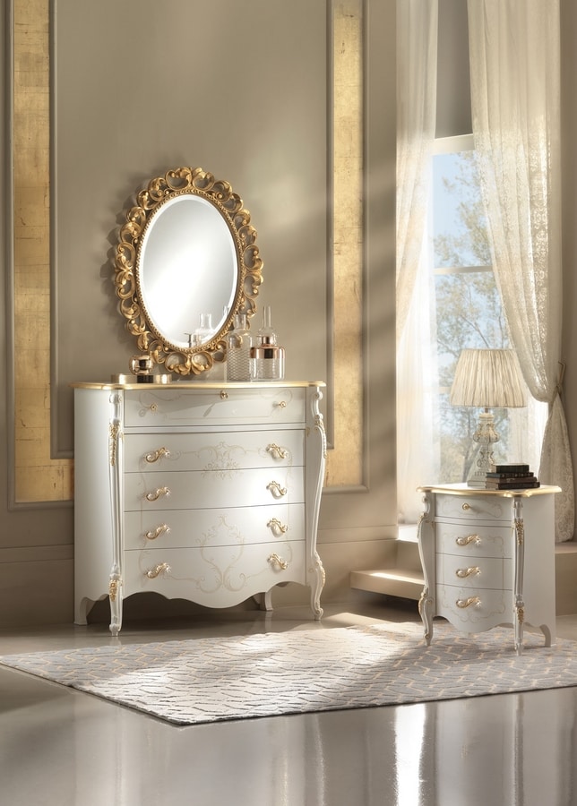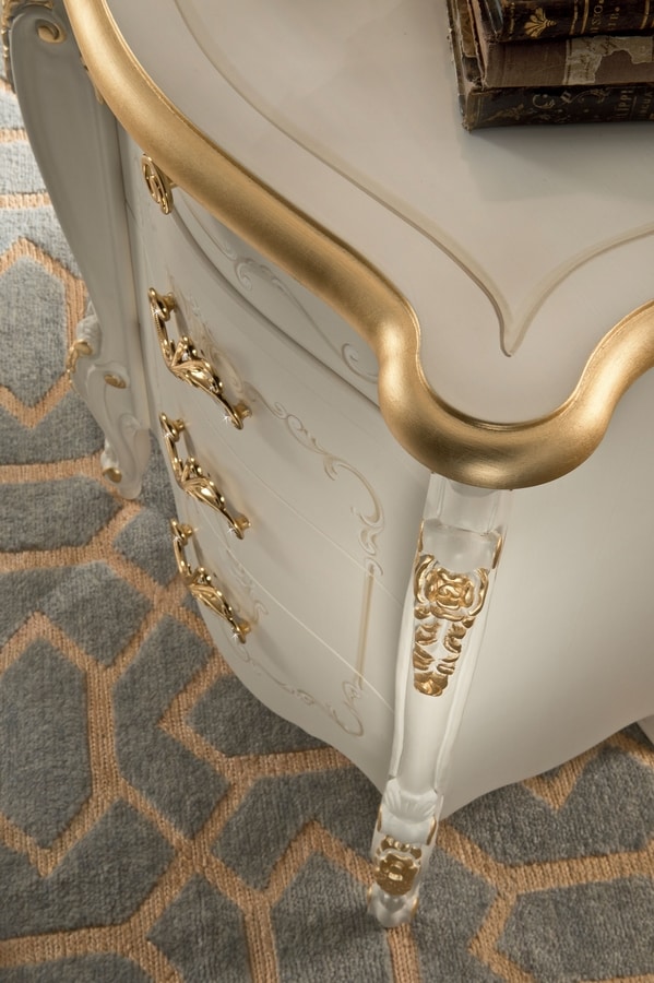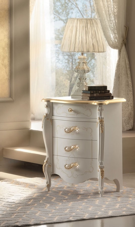 Comodino a 4 cassetti, in legno laccato, con dettagli foglia oro.