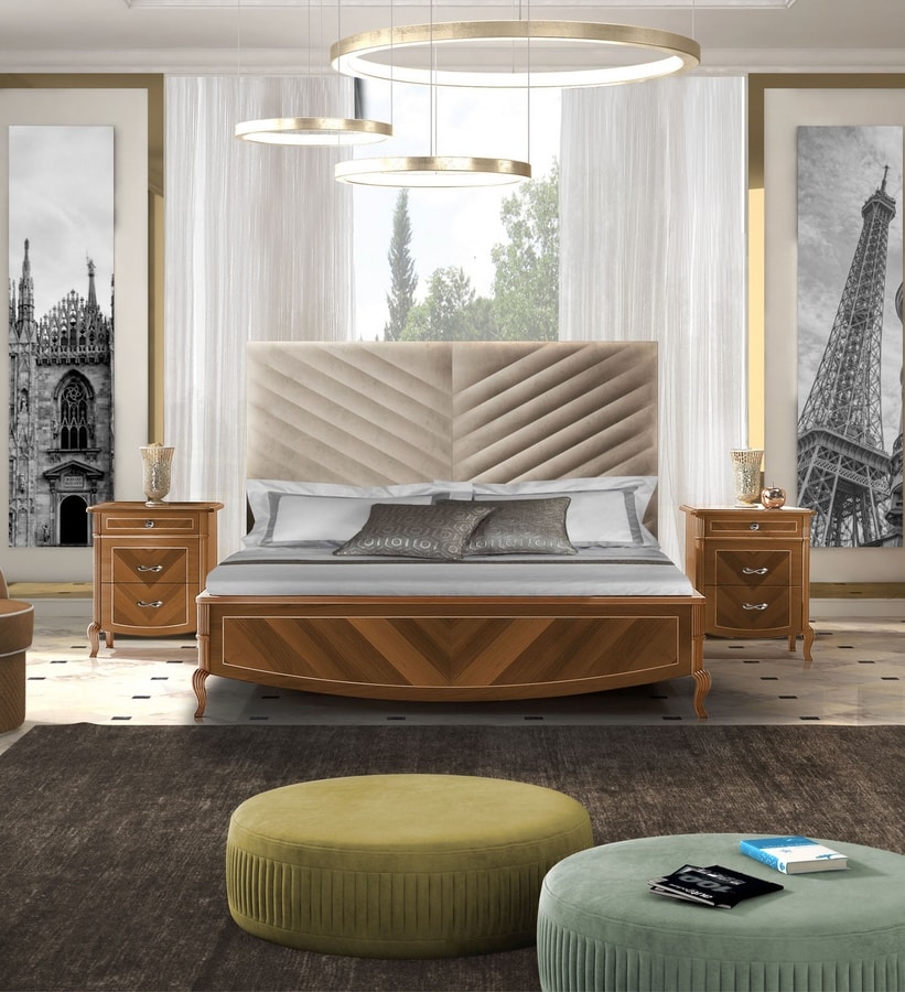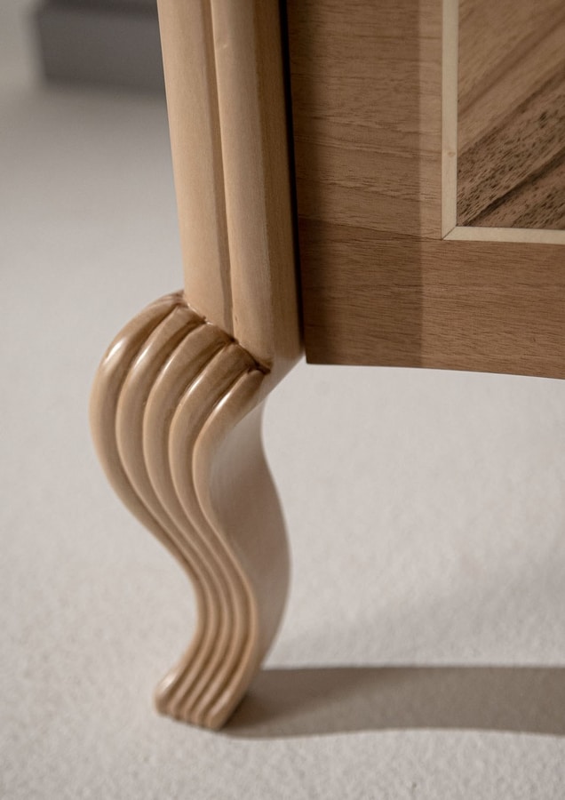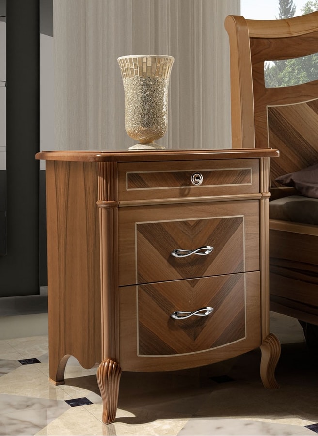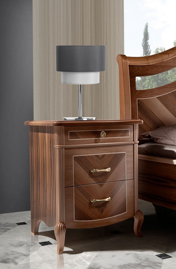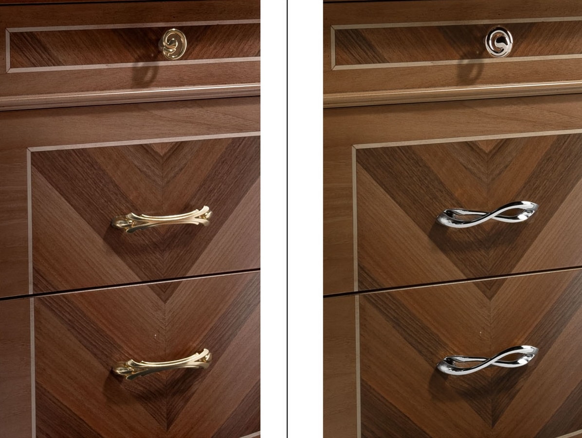 Comodino con impiallacciatura in vero legno di noce con lavorazioni artigianli ed intarsi che rendono la collezione Prestige 2 preziosa e unica. Disponibile in 3 tonalità di noce, arrichita di dettagli i foglia Oro o Argento. Maniglie in ottone lucido o cromo lucido.