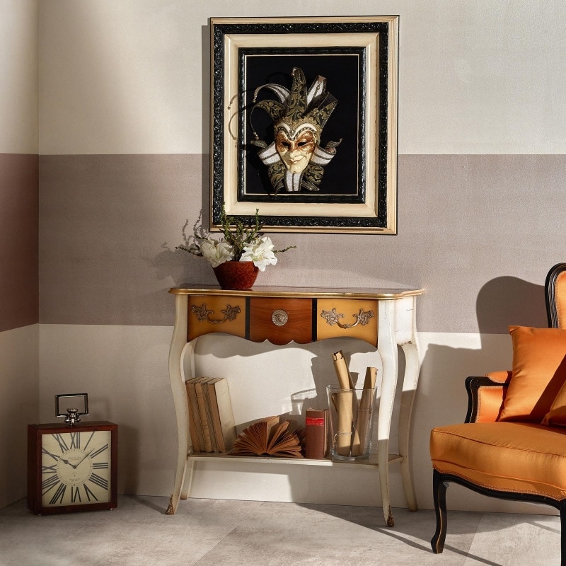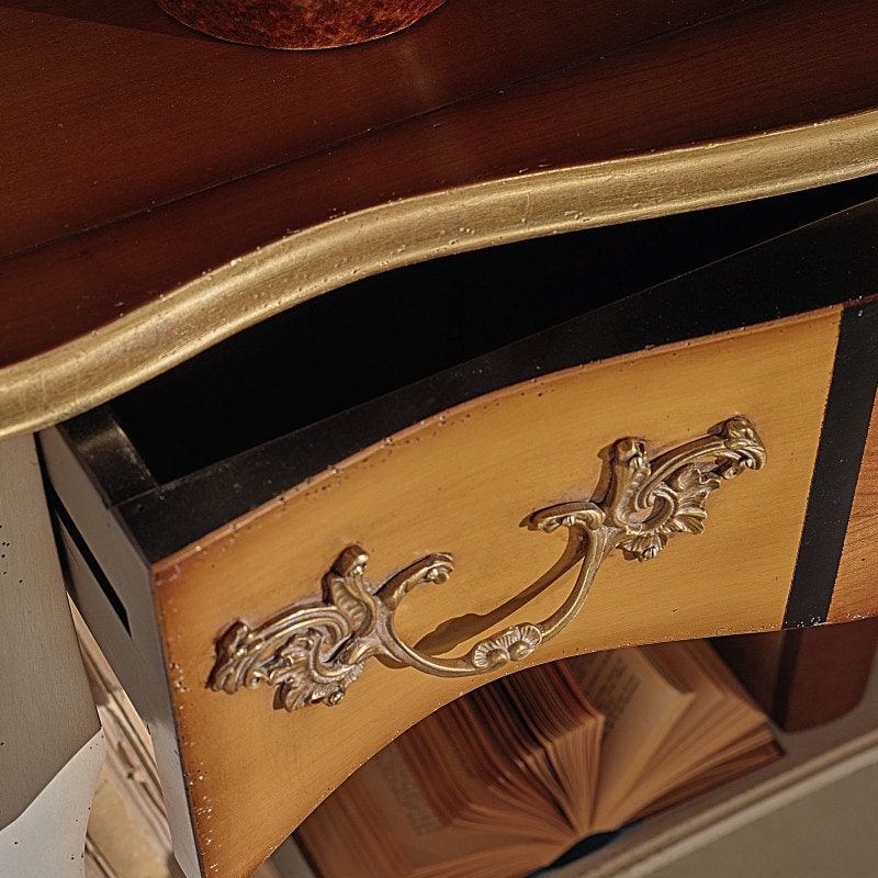 Consolle con un cassetto arricchito da maniglie lavorate e diversi fregi decorativi in metallo. Gambe sagomate che sostengono un utile piano d’appoggio. La morbida forma del piano e delle gambe si adatta ad un ambiente ricercato e raffinato.