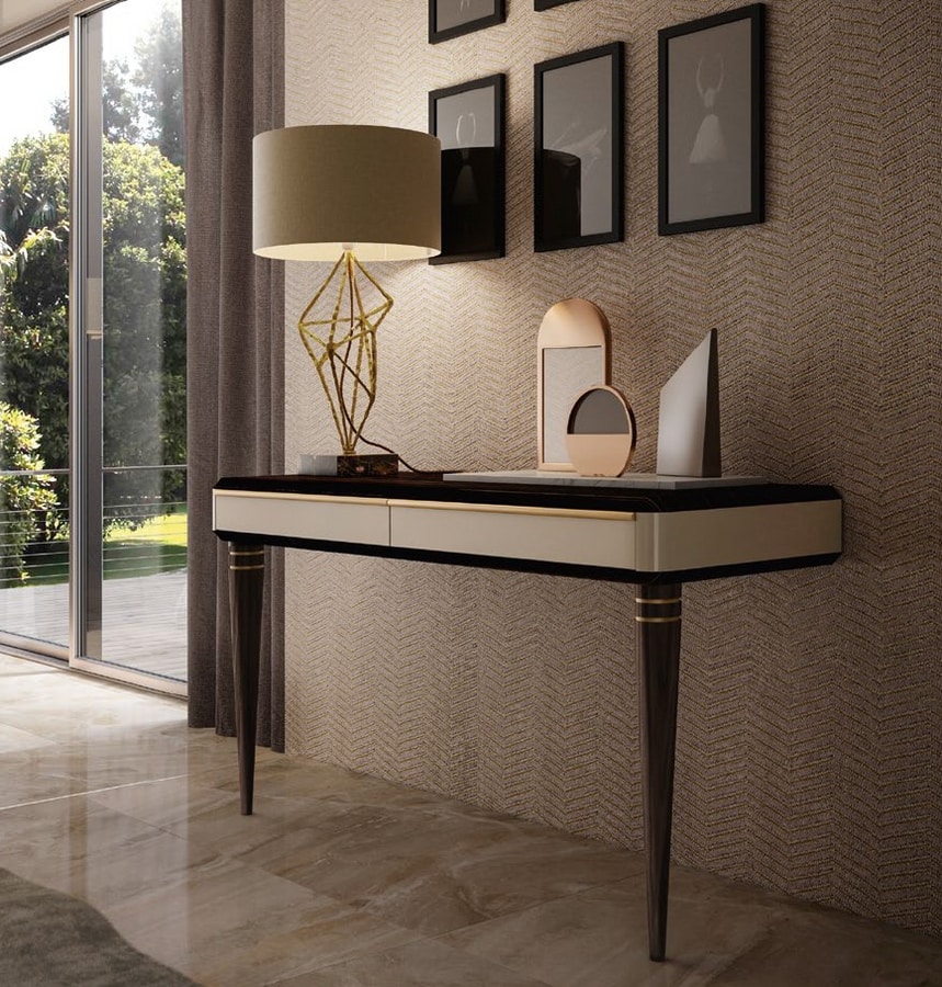 Consolle in legno, con due gambe tornite. Frontali in legno laccato. Dotata di due cassetti.