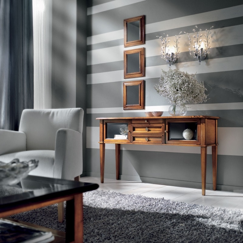 Consolle con tre cassetti e due portine a vetro. Il cassetto superiore è liscio, mentre i due inferiori son incorniciati a telaio. Piano leggermente sporgente dal perimetro del mobile, basamento liscio. Le gambe a spillo rendono il mobile leggero ed elegante.