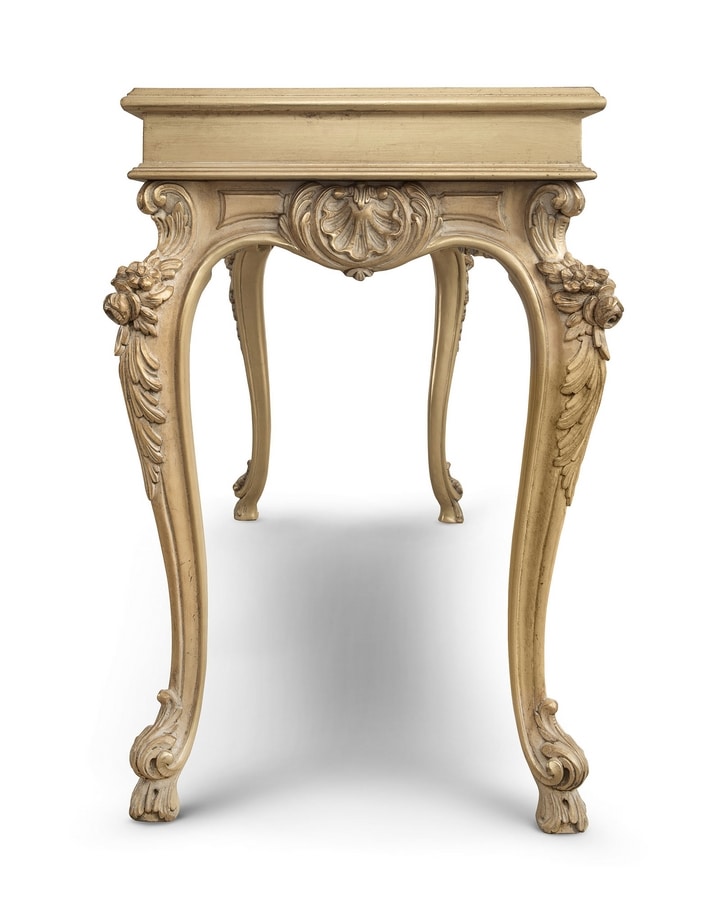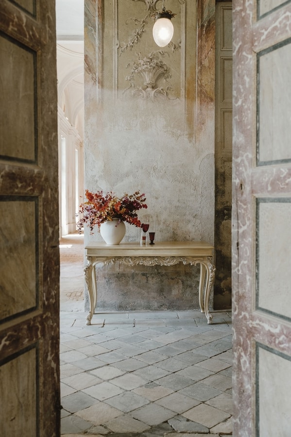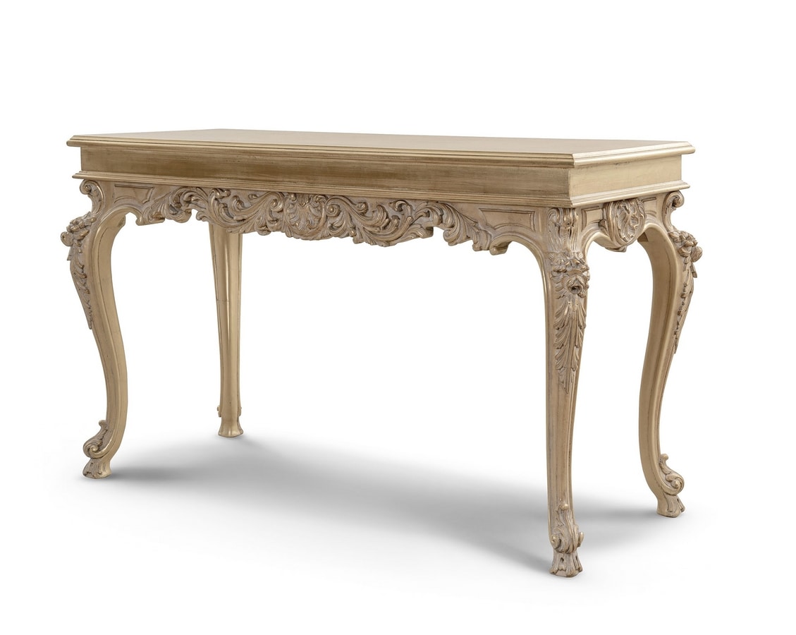 Consolle classica caratterizzata da intagli fatti a mano ed impreziosita dalla finitura OCH oro foglia patinato bianco meringa.