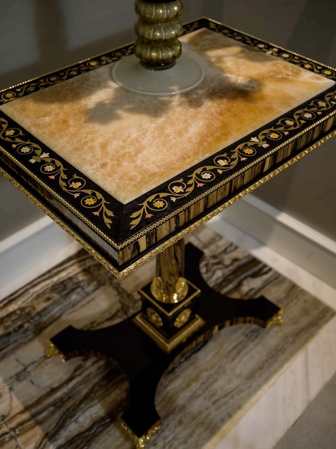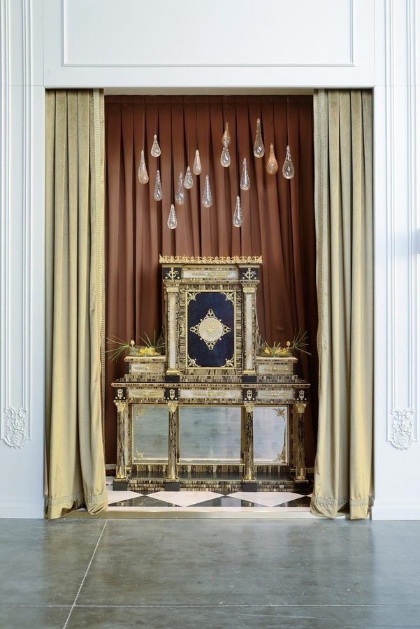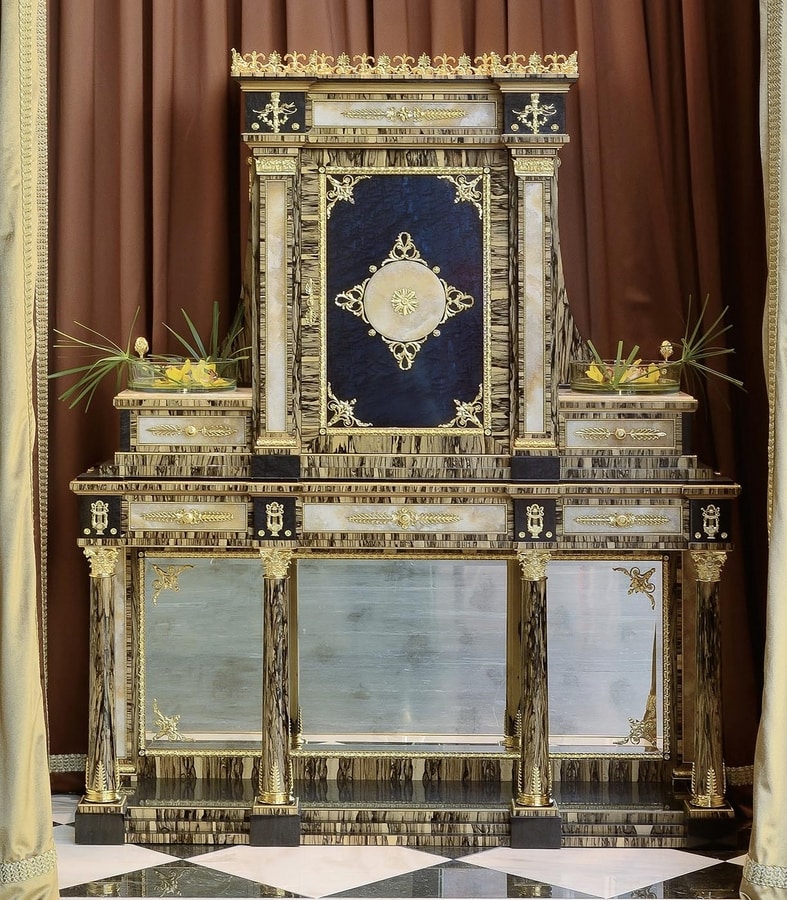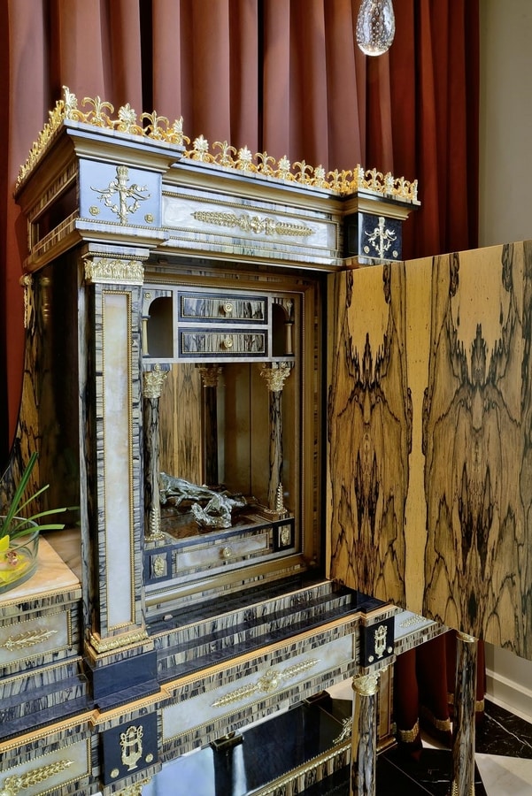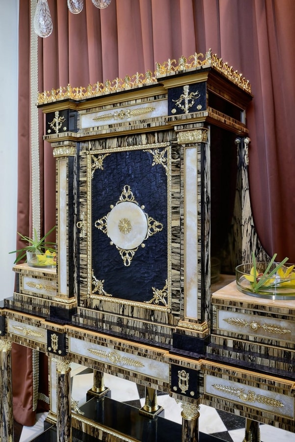 Stipo in massello di Tulipier, in Erable nero ed Ebano bianco con bronzi in bagno oro, Marmi in Onice mielato. L'accostamento di varie essenze nelle loro naturali tonalità e dei preziosi materiali come marmi, bronzi e lo specchio anticato, danno vita a questo lussuoso e maestoso pezzo , ideale per grandi hall di ingresso e saloni. Gli stessi materiali sono riproposti nel tavolino rotondo in Ebano bianco con intarsi in essenza e ottone, piano in onice e applicazioni in ottone finitura bagno oro finemente lavorato. Accompagna lo stipo , per lussuose majlis