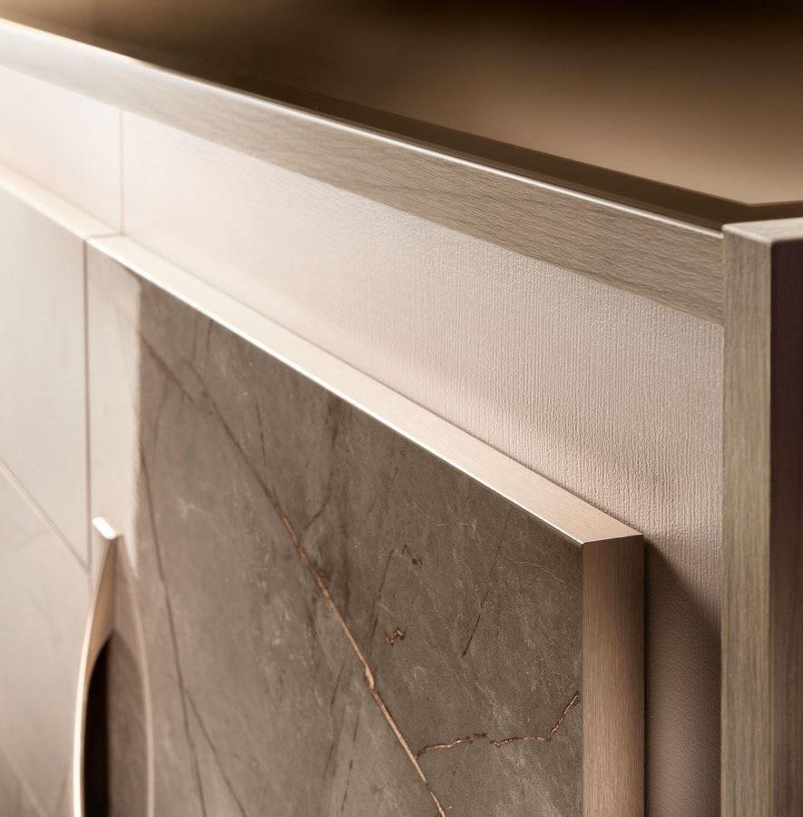 Ambra è una collezione di arredi per la zona giorno, notte e living. Ancora una volta, Adora lascia la sua firma inconfondibile su elementi d’arredo in grado di portare alto il pregio del gusto italiano per l’arredamento in tutta la sua eleganza, sotto il segno inimitabile dello stile contemporaneo. Ciò che dona carattere ad ogni singolo elemento è il contrasto materico e un deciso gioco di volumi tra le diverse superfici. Dettagli sofisticati che non passano inosservati. Le strutture dei mobili in finitura di legno d’olmo contrastano elegantemente con le ante dalla texture materica e porosa a loro volta sovrapposte da pannelli in finitura marmo. Soluzioni d’arredo dalla silhouette slanciata e raffinata in cui si ripete lo stesso gioco di contrasti, ravvivato dai profili di maniglie e piedini in bronzo satinato. Altra caratteristica degna di nota è l’equilibrio tra le delicate nuance che vestono di raffinatezza ciascun mobile e i riflessi vivaci dei vetri specchiati che, come un gioiello, donano luminosità all’intero scenario d’arredo. Sono questi i particolari che delineano l’essenza della collezione e conferiscono continuità estetica agli elementi pensati per arredare ciascun ambiente. Di fatto, l’effetto gloss del marmo viene riproposto anche sulla superficie del tavolo così come i bordi profilati in bronzo, che esaltano la silhouette del mobile.