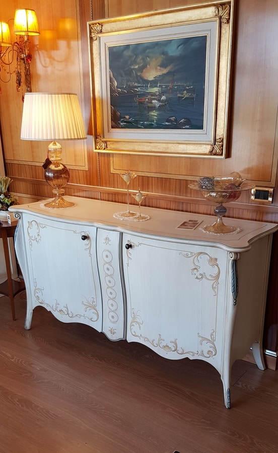Credenza 2 ante e un cassetto con apertura push-pull laccata bianco a tempera e decorazioni eseguite a mano.